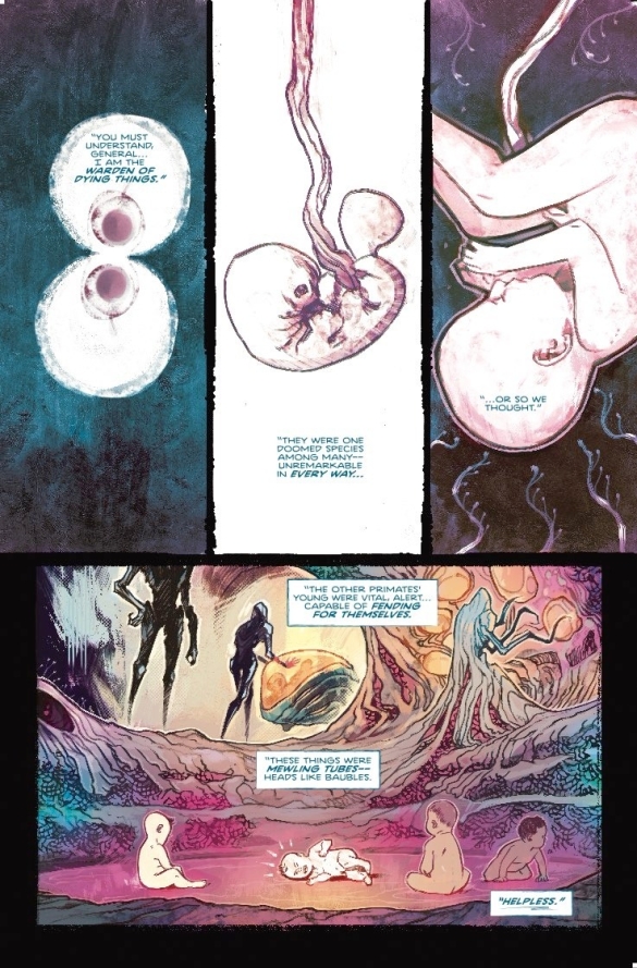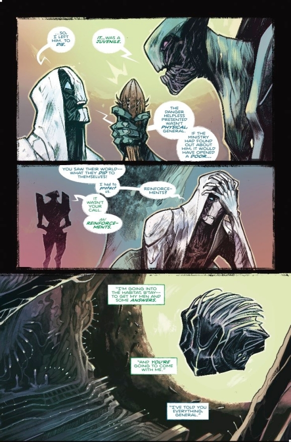 In the second chapter of ALEX PAKNADEL & CASPAR WIJNGAARD’s gripping new series, the Earth habitat is under military control and is being strip-mined for its genetic riches. Its most fearsome predators are now fair game for a species that can graft their most lethal traits into terrifying biological warsuits.However, unbeknownst to General Cov’n and his alien warriors, the hunters have become the hunted. Helpless, the habitat’s lone human survivor, lusts for revenge on his captors and will stop at nothing to see them torn limb from limb. Featuring exciting variant covers by DANI (COFFIN BOUND, The Low Low Woods) and 2022 Russ Manning Promising Newcomer Award-winning artist LUANA VECCHIO (LOVESICK, BOLERO)!