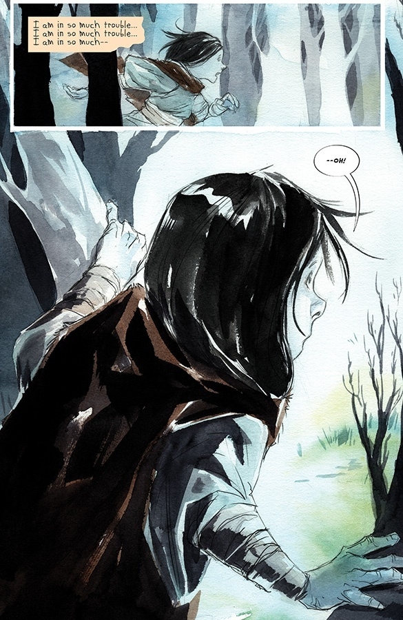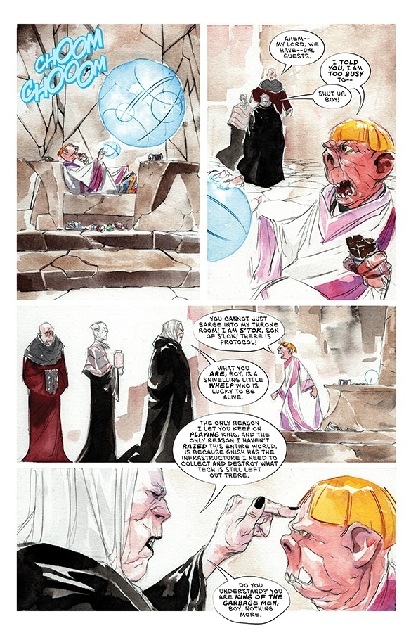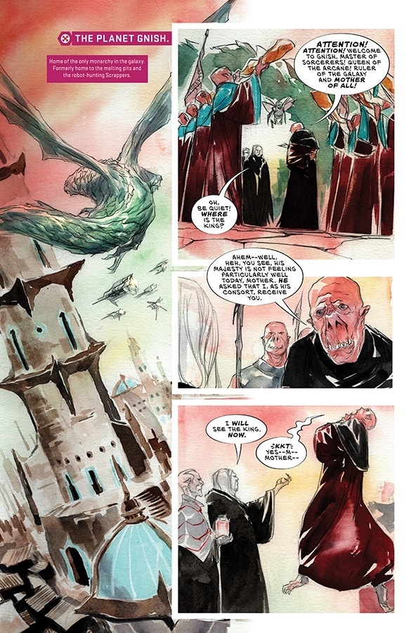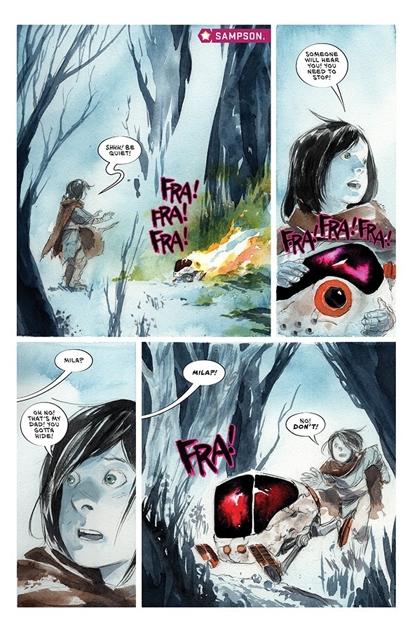 "THE HAUNTED GALAXY," Part Two (of Five)Mila reunites her dad Andy with his old robot pal, Bandit, but their heartwarming reunion doesn’t last for long. It’s forbidden to have robot tech, and soon they’re on the run from a troll militia with a vampire commander. Meanwhile, the vamp witch Mother moves to consolidate power on Gnish.