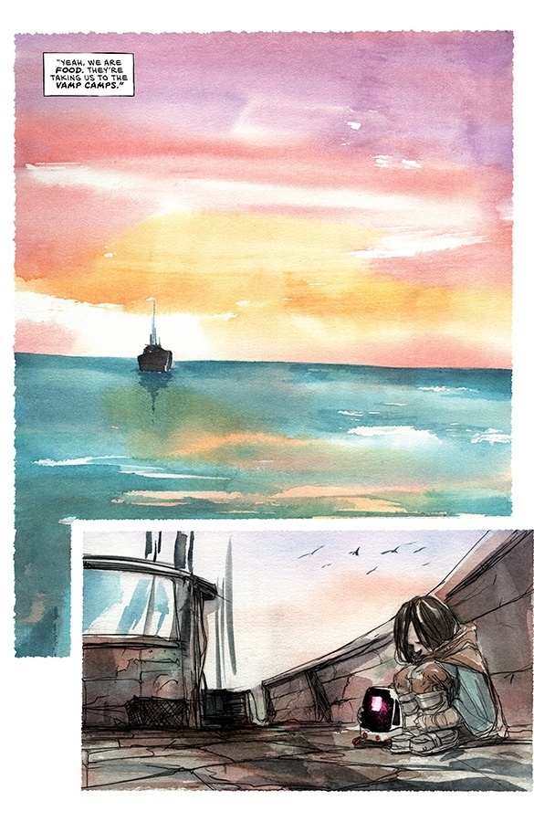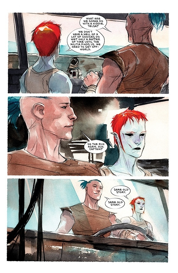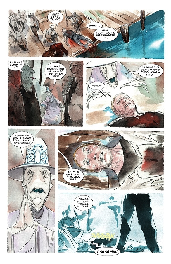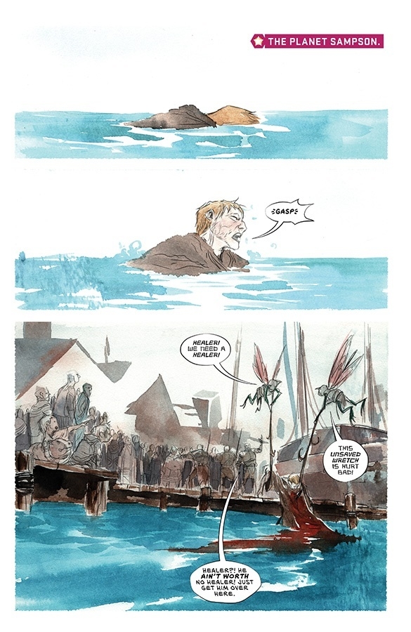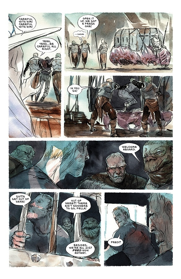 "THE DEAD SEA," Part OneThe hit fantasy series from powerhouse creative team JEFF LEMIRE and DUSTIN NGUYEN continues!After a bruising escape attempt, Andy finds himself in the clutches of the Militia, which means the murderous Mother can’t be far behind. Meanwhile, Mila books passage on a ship piloted by none other than the irascible Captain Telsa!