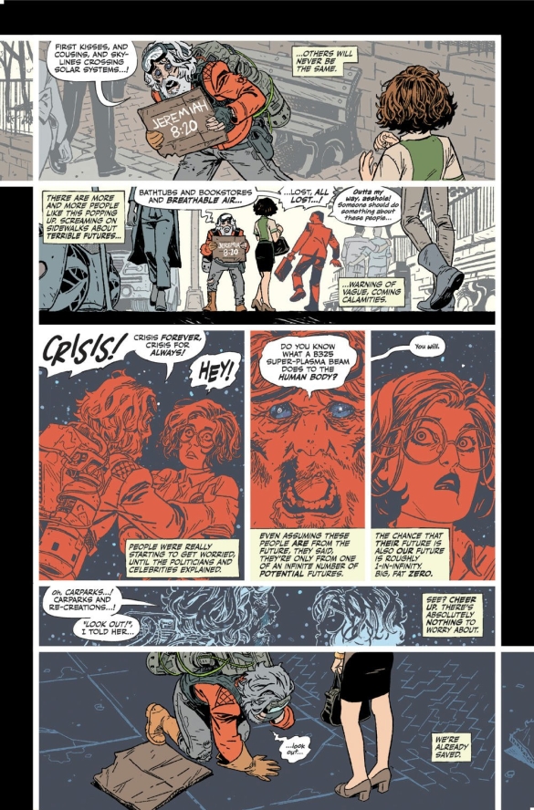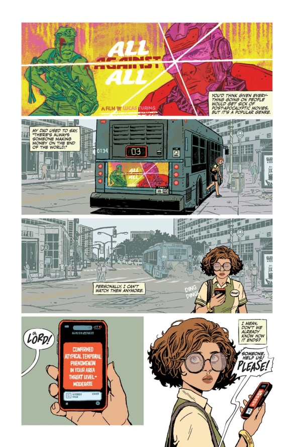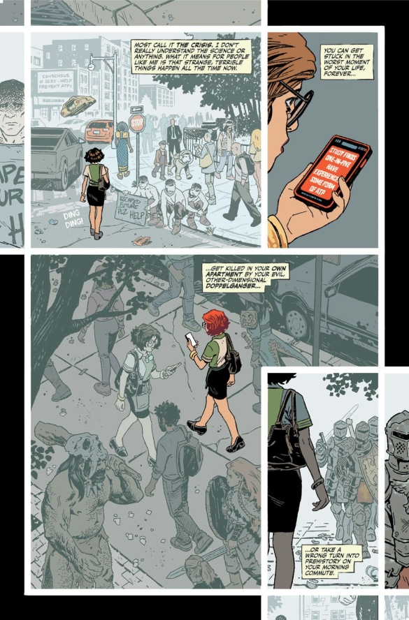 Mingling in the red-light district, you can find actual cavemen, medieval knights, and cyborg soldiers on leave from World War IV. Victorian debutantes amble their way into cell phone stores, confused and bewildered (what is a data plan?). On their way to work, bleary-eyed commuters get trapped in time-loops, assaulted by alternate-reality versions of themselves, and try to avoid post-apocalyptic wastelands. And LOOK: the 3:15 bus just took a wrong turn…into the neolithic era.