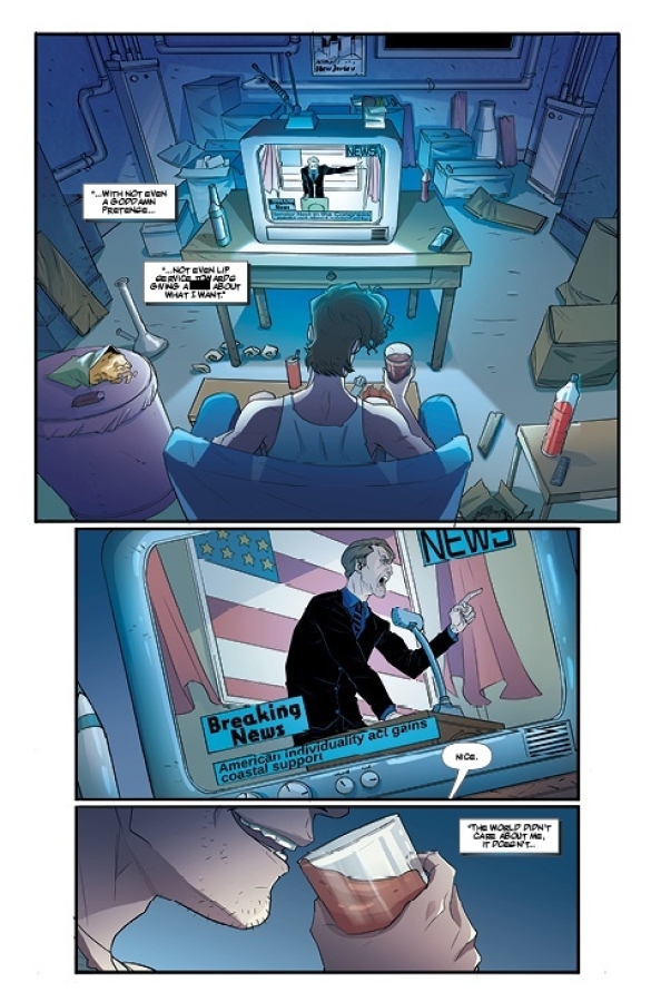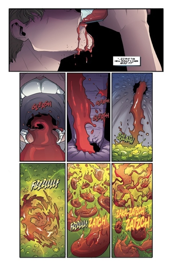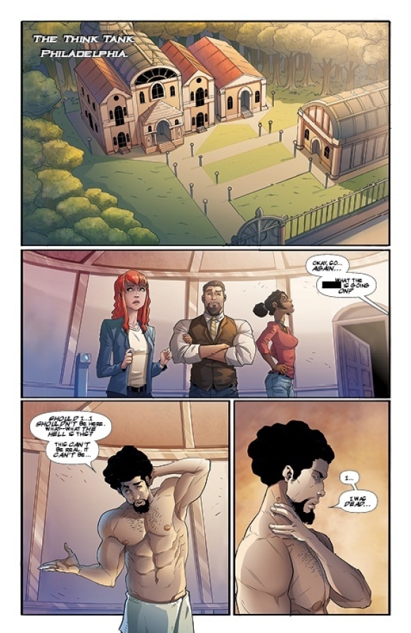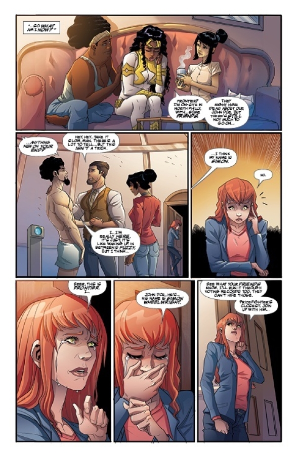 The Crisis Command interrogates a ticking clock corpse! But how can heroes save a world without empathy? FIRST they have to figure out how to save it within themselves, as Nina Next, the incredible science hero FRONTIER, takes John Doe Empathy out on the town...to discuss their secrets.