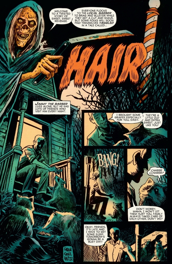 The Creep scares up two all-new standalone stories in this star-studded anthology based on the hit Shudder TV series. Francesco Francavilla (Night of the Ghoul Detective Comics) and Lisa Francavilla welcome you to a barbershop where the locals share tales of their greatest kills and the hunters can just as easily become prey. Ariela Kristantina (Chain) and Jorge Corona (The Me You Love In The Dark) journey to a temple hidden within an island paradise where many visit but not everyone leaves.