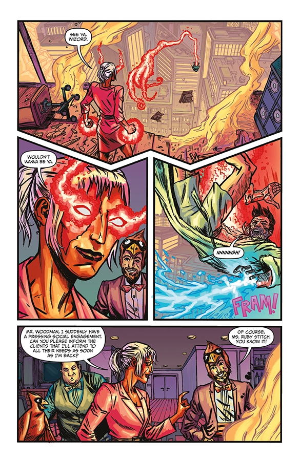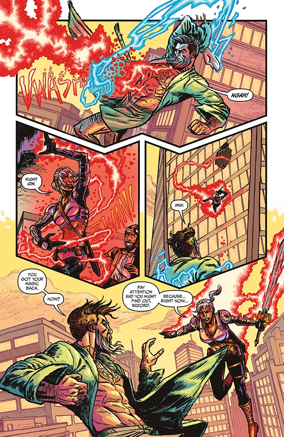 "THE HOLE DAMNED WORLD," Part Two Wizord's wizard-for-hire business has gotten itself a little competition as a mysterious new wizard opens up a shop down the way! Our hero is less than pleased, especially since he'd rather be searching for his still-missing friend Margaret. Meanwhile, Sizzajee lays out the surprising origins of the Hole World.