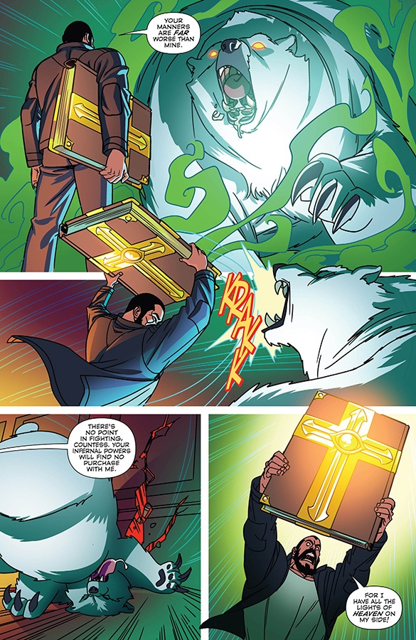 "EARTH CALLING," Part Four Valla has delivered a crippling blow to the oil industry. Now she faces her first real challenge in the form of Samael. He might be the son of the Angel of Death. Or he might just be an insane former underwear model. But what's for certain is he possesses the most powerful weapon on the planet, and he's bringing it to bear against Valla. The manure is about to get real, folks.
