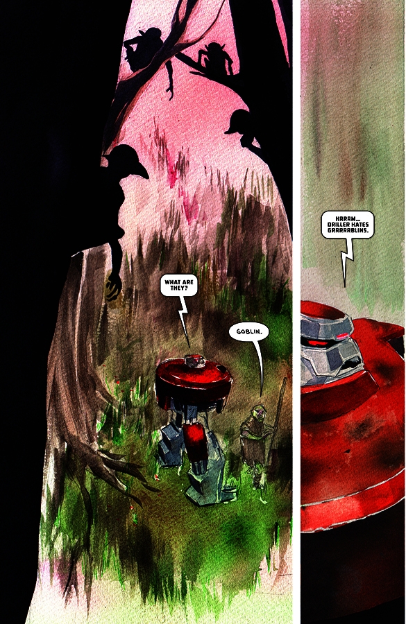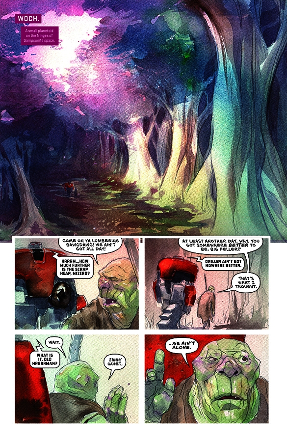 "RISE OF THE ROBOTS," Part Three The fall's big DESCENDER event continues in the strangest and most shocking issue of DESCENDER yet, as the fate of the fan-favorite robot, DRILLER is finally revealed! Stranded on the planet Woch, Driller meets an old nomad called Mizerd. But he soon realizes that Driller may be a real killer and Mizerd is a real wizard! Magic comes to DESCENDER, and the universe will never be the same!