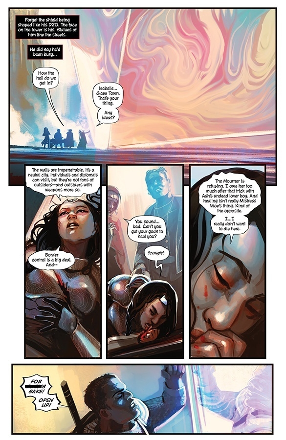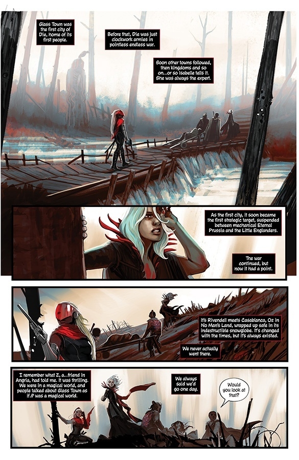 "FANTASY HEARTBREAKER," Part FourOur heroes reach the civilization of Glass Town and do what heroes have always done upon reaching civilization. As in, go to the pub. As it’s DIE, you can guess people don’t exactly get happy drunk.