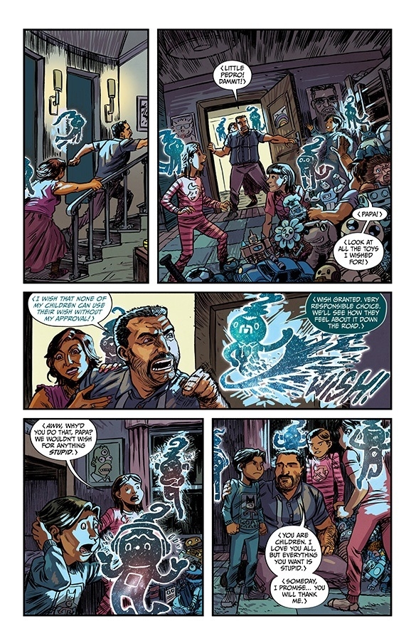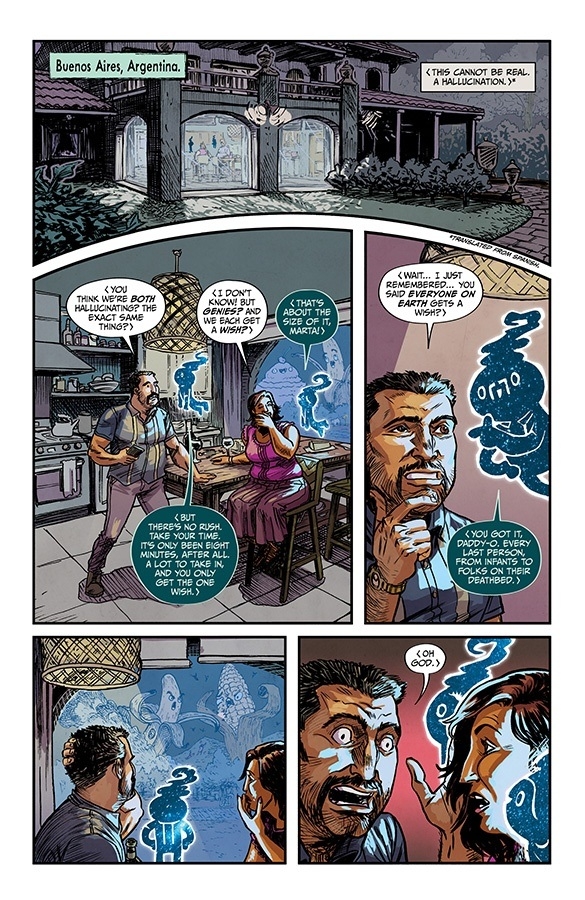 EIGHT BILLION GENIES have appeared on earth with one wish for everyone on the planet. We’ve seen the first eight seconds after the genies arrived, and the first eight minutes—now brace yourself for the first eight hours, when many insane and foolish and wonderful wishes are made, and our heroes (a group of lovely people stuck in a dive bar in Detroit) try to survive the growing wishpocalypse!