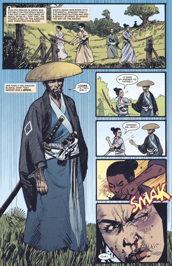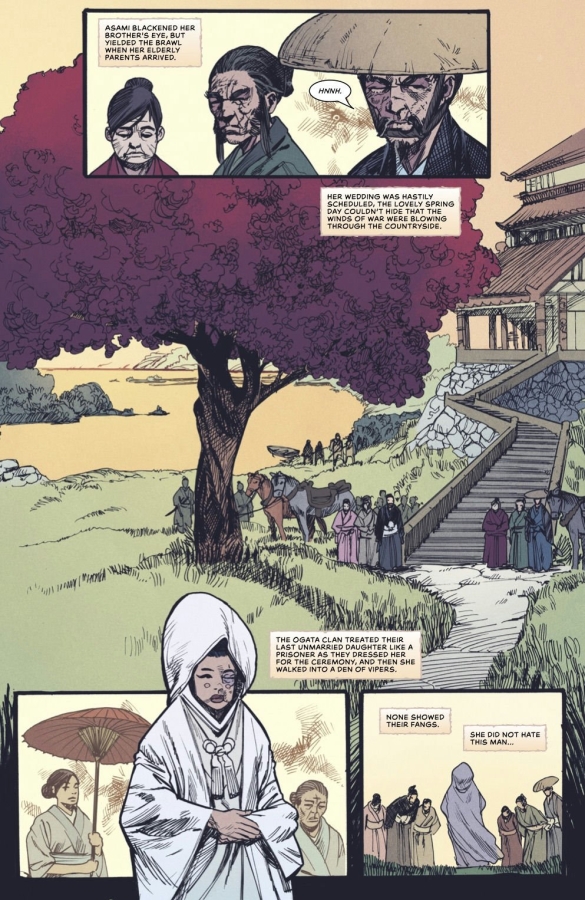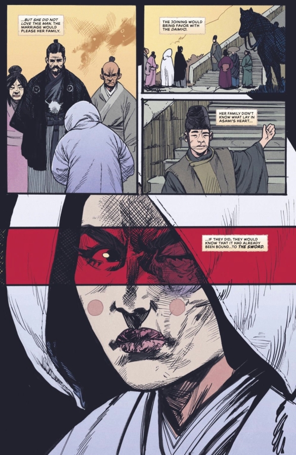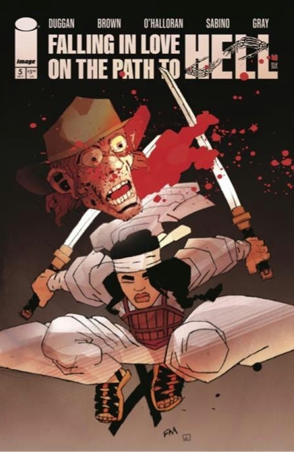 Hearing that FRANK MILLER enjoyed the debut issue of FALLING IN LOVE ON THE PATH TO HELL sent me into orbit. Frank’s directly responsible for my brain marinating in samurai culture, Ronin is a timeless masterpiece and his indelible overs to the American reprints of Lone Wolf and Cub were my gateway into one of the best comics ever made. It’s not hyperbole to say our comic wouldn’t exist without the inspiration from Frank. Our entire team is delighted and grateful that Frank is sharing his talent on a guest cover for the start of our second arc. A true dream come true. —GERRY DUGGAN