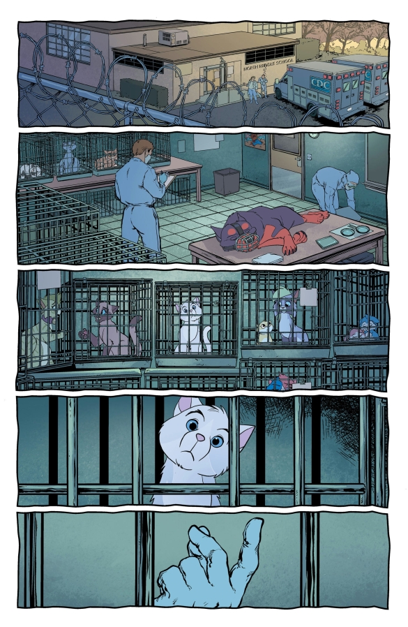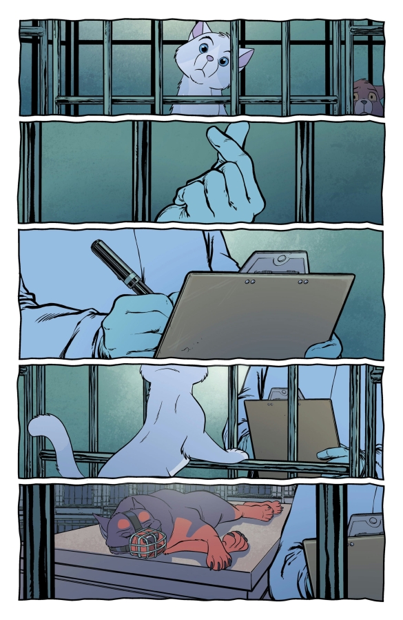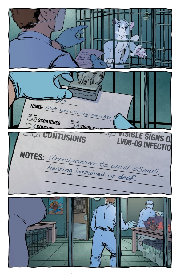 NEW STORY ARC Like all good 21st issues... a SILENT INTERLUDE! Moosh the Pitbull is missing and only one cat can find him. As the mysterious GHOST searches for his canine friend, he discovers something that will change the world of FERAL forever! Don’t miss out on this thrilling issue told through the POV of everyone’s favorite hearing impaired feline. PLUS: A last page shocker that will make STRAY DOGS fans sit, stay, rollover and beg! (hint! hint!)