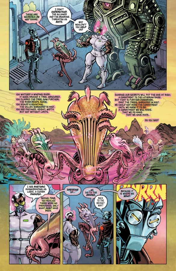 RED ALERT: The Orouran Empire has attacked! Isolated, outgunned, with aging ships and weaponry, the revolutionary heroes of the Freedom Guard mount a daring defense in a space dogfight that could only happen in comics and absolutely MUST be read in print. PLUS: The arrival of Yrl-Ken, an alien ambassador from the enigmatic Quadros Hive.