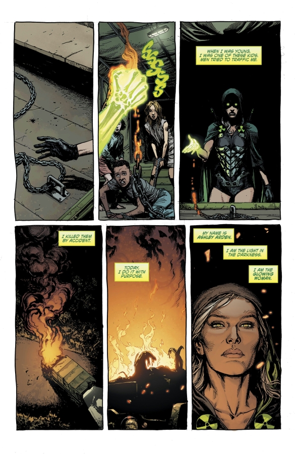 A special spotlight on ASHLEY ARDEN—THE GLOWING WOMAN. Now on her own and off the grid, Ashley sets out on a harrowing personal mission: to rescue children from traffickers like the ones she was once hunted by. But her fury burns hot—and so does the trail of destruction she leaves behind. As Ashley blazes her own path forward, the threads of the Unnamed Universe begin to converge—and the future of GEIGER starts here.