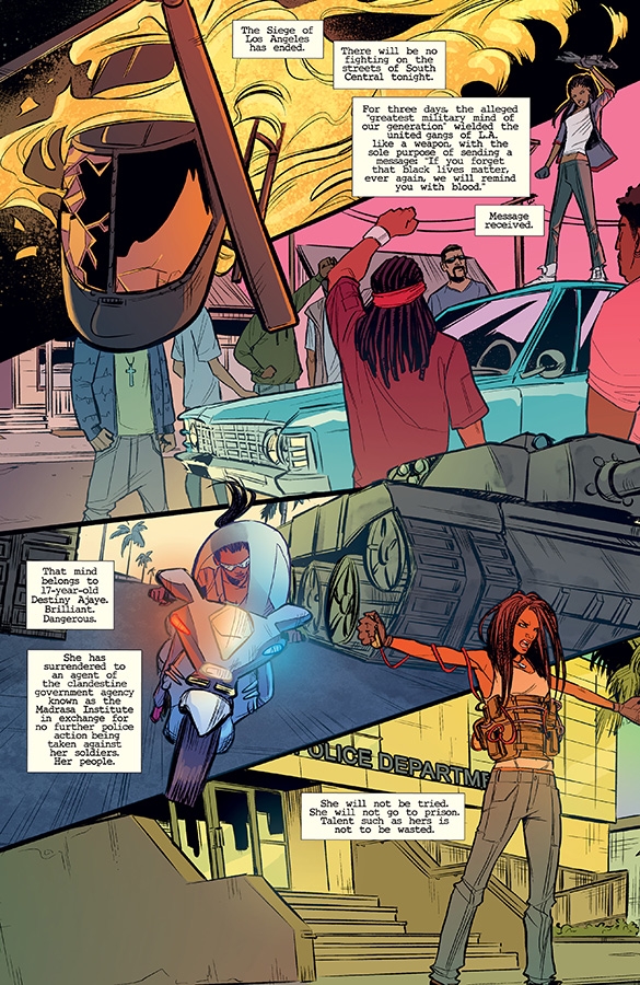 Seventeen-year-old Destiny Ajaye took on the LAPD in her South Central Siege and paid for it—not with her life, but with her freedom. Now, Destiny is sequestered in the Madrasa Institute, a government school for prodigies. But will she use her gifts to wage war at the military’s behest—or is she already planning another revolution? From writers MARC BERNARDIN and ADAM FREEMAN (Castle Rock, Alphas, X-Men Origins: Nightcrawler, The Authority, The Highwaymen) and rising-star artist ROSI KAMPE, comes a sequel that promises to set Destiny’s world—and ours—ablaze.