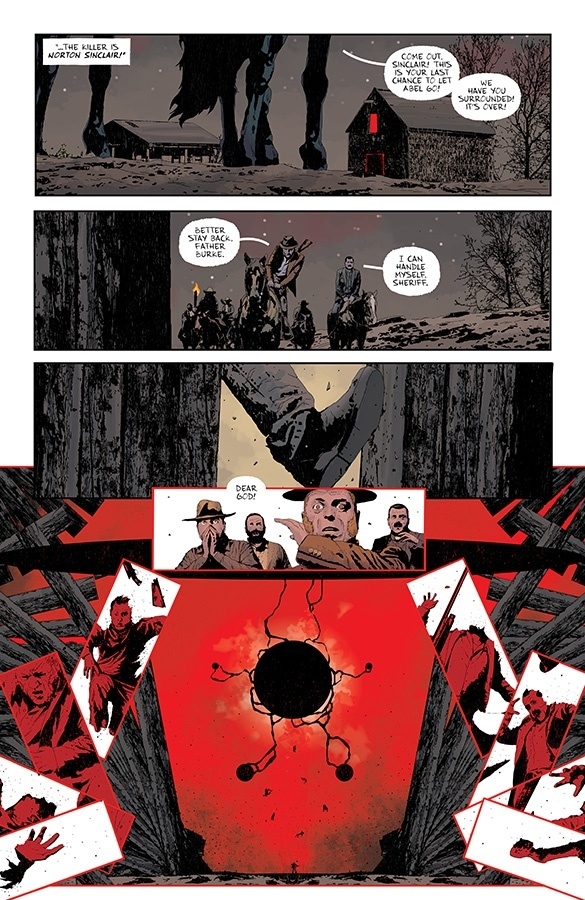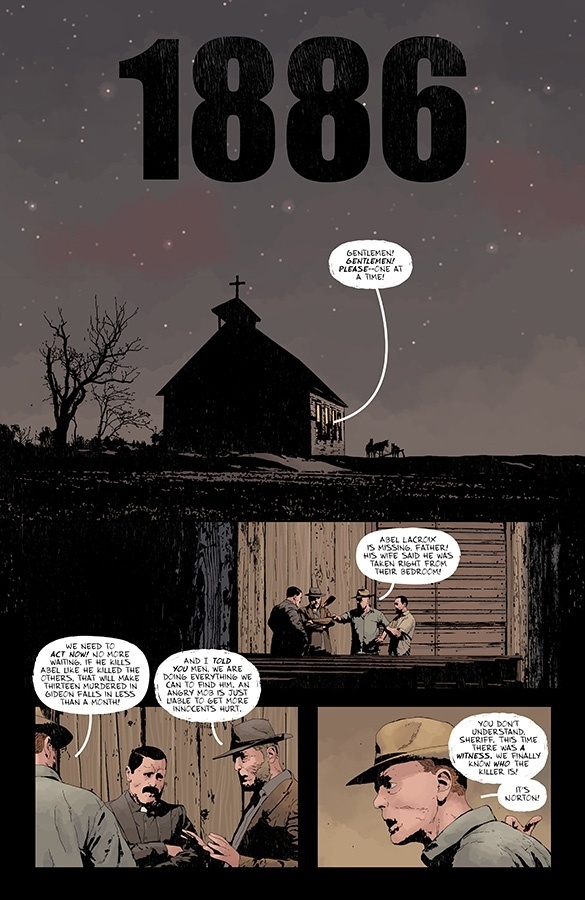 "STATIONS OF THE CROSS," Part OneThe hottest series of 2018 returns from the creative team that BRIAN MICHAEL BENDIS said "will go down as one of the greatest comic teams of all time!"After the mind-blowing events of the second arc, our story heads right through the looking glass back to Gideon Falls, 1886! Once there, a Father Burke must help catch a vicious killer named… Norton Sinclair? And when the killer can travel through time (and space), readers are in for a wild ride.