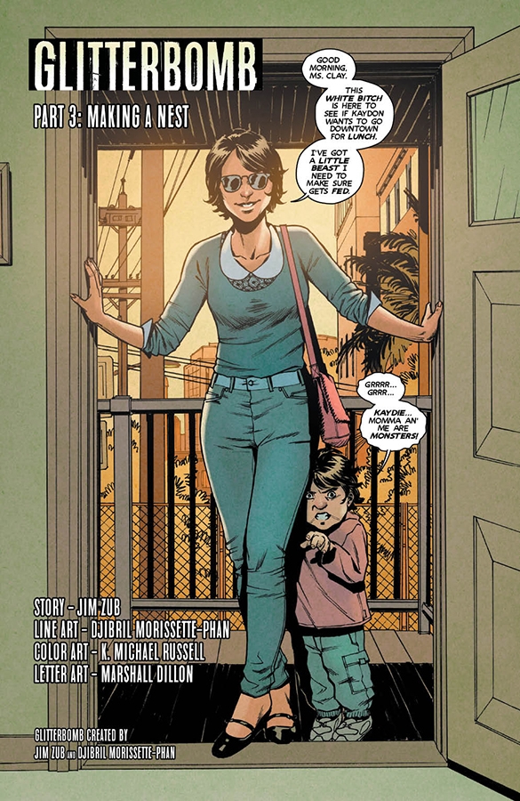 "I GAVE HIM A PIECE OF MY MIND..." Fan-favorite JIM ZUB (WAYWARD, Thunderbolts) and newcomer DJIBRIL MORISSETTE-PHAN tear into the heart of Hollywood in GLITTERBOMB, a dramatic horror story about fame and failure.