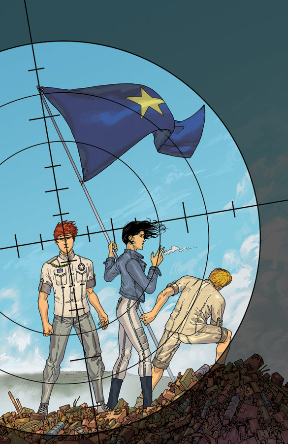 "NATION BUILDING," Part OneNew arc! Great jumping on point! Over a year has passed since "The Battle of New Texas" and the settlement has opened a plastic frontier rife with opportunity. But when eco-terrorists threaten plans for expansion, a growing cast of patriots, plunderers, monsters and thieves conspire to tear it all down.