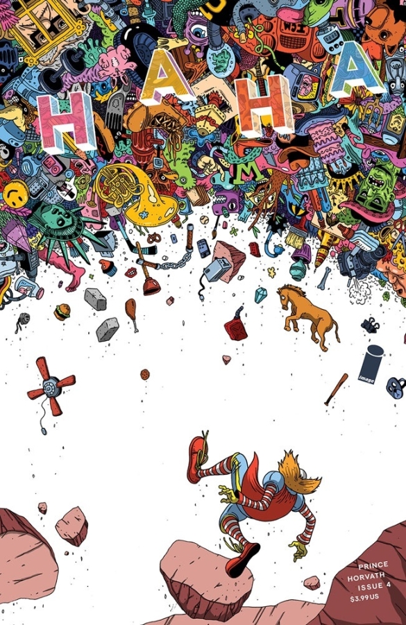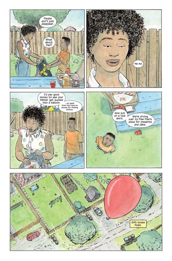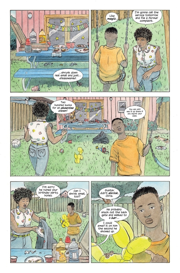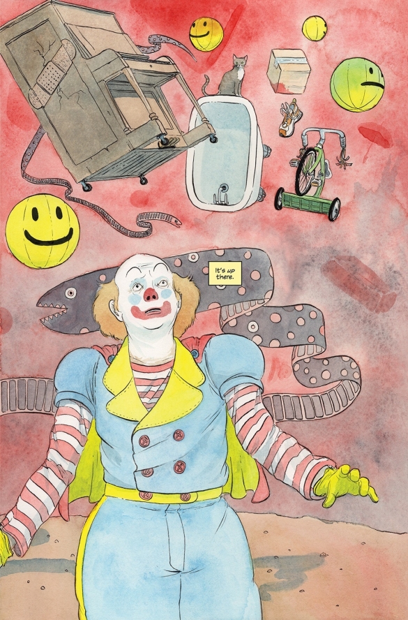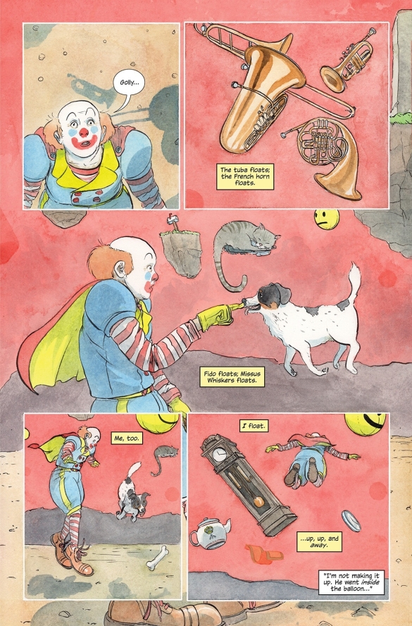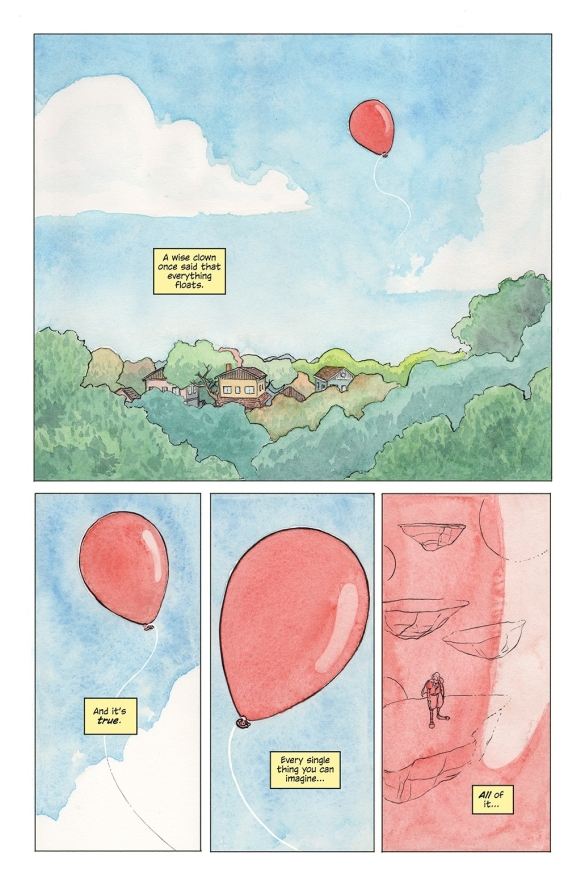 "GUSTAV IN THE WORLD OF FLOATING OBJECTS"A wise clown once said that everything floats…and he was right. The comic book with a literally laughable title drifts into the big, blue sky with an issue hand-painted by watercolorist PATRICK HORVATH.