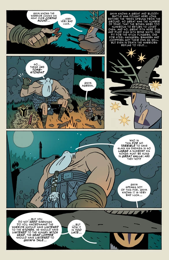 Norgal and Agatha pass through a dark forest with a particularly grim history, where they meet a strange little creature named Gnym. Is he a friend? Or does he just want to see undead giants squish the HEAD LOPPER to meat-jelly? All this… and more!