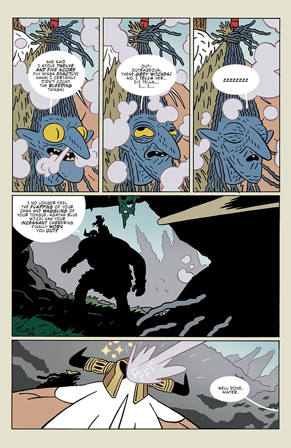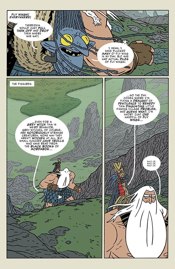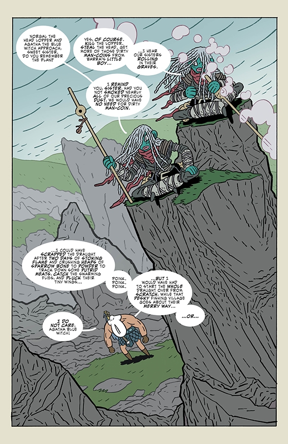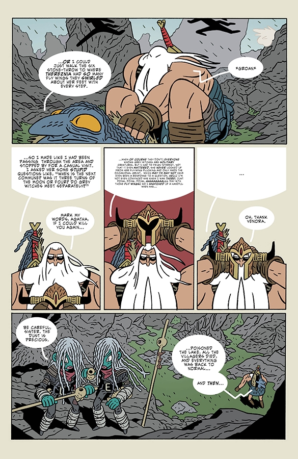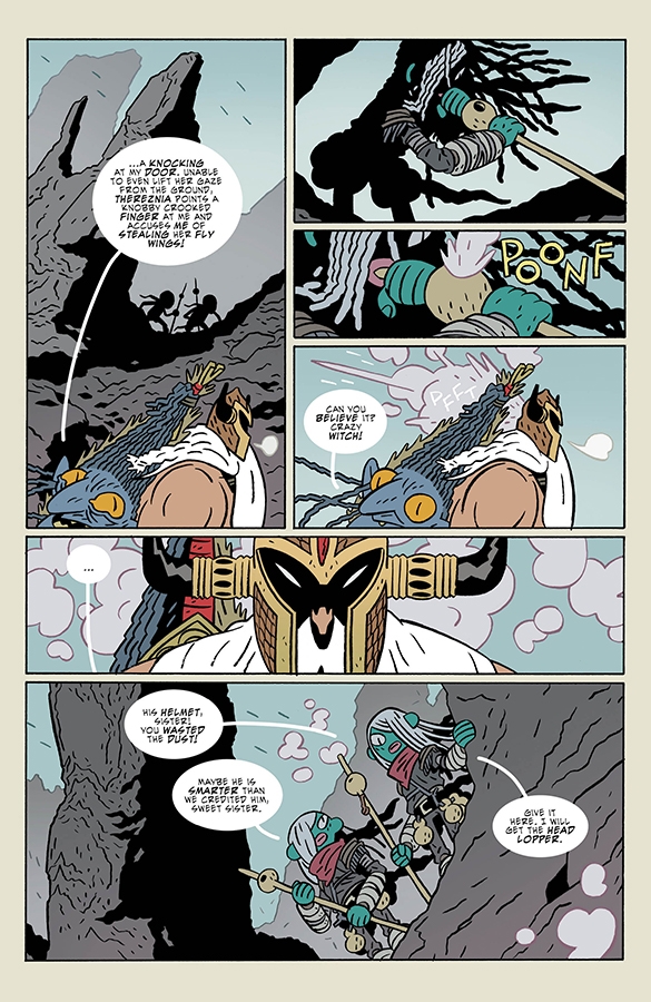 Norgal meets fellow adventurer Zhaania Kota Ka while battling a poison barb-shooting mega-arachnid from the elder region of Hell, home of the Under Gods. Agatha meets a fellow disembodied head while sitting on a table.