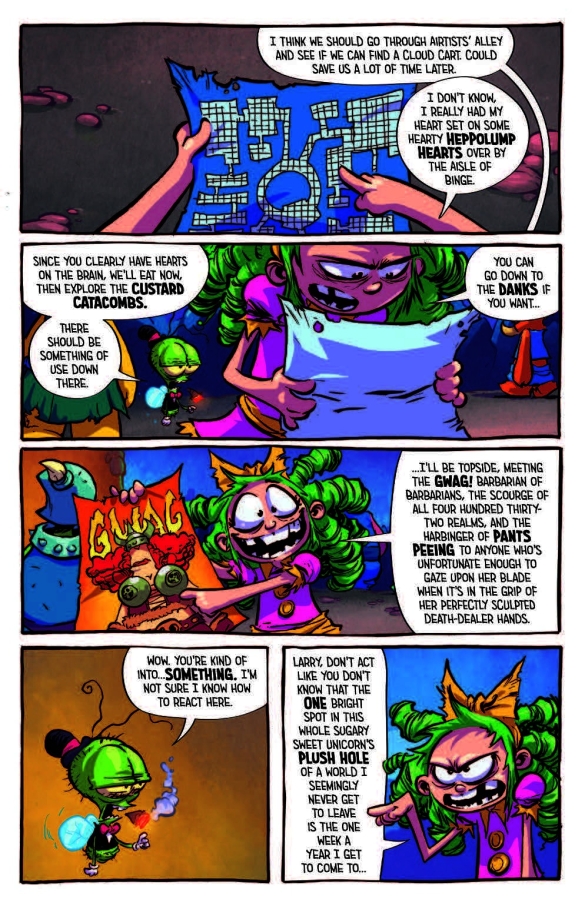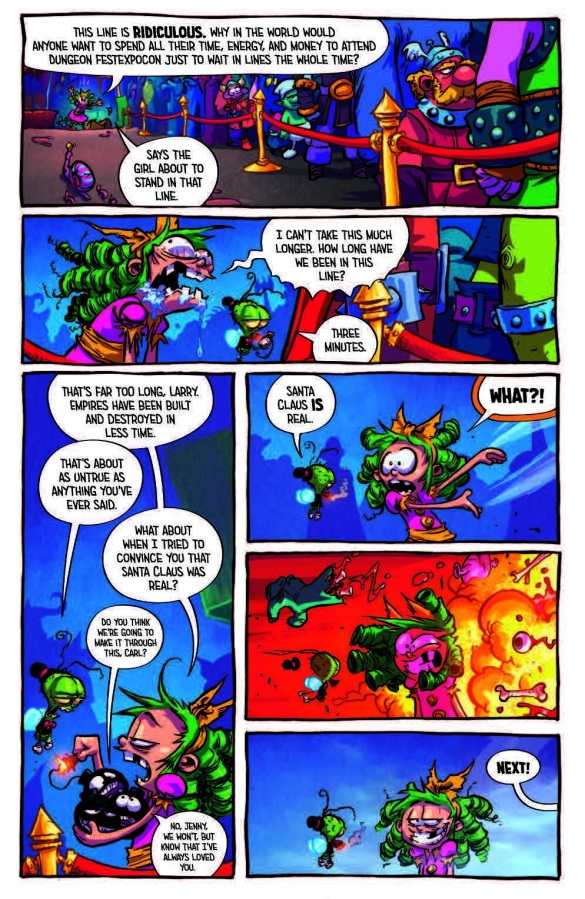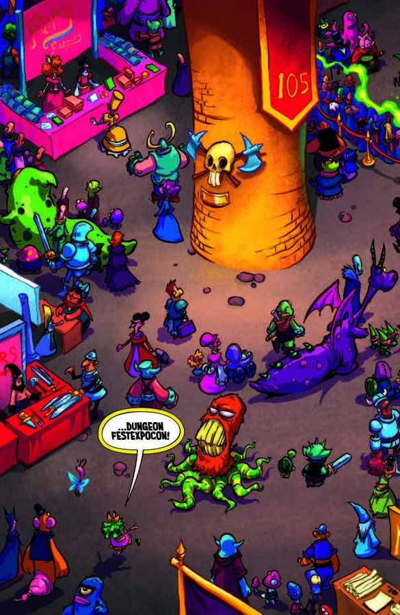 NEW STORY ARC "CON GIRL" Gertrude is back in her hit-comedy/fantasy/all-out bloodbath of a comic, I HATE FAIRYLAND. Gert and Larry take a break from their normal questing and killing for some fun at Fairyland’s annual Dungeon Con.