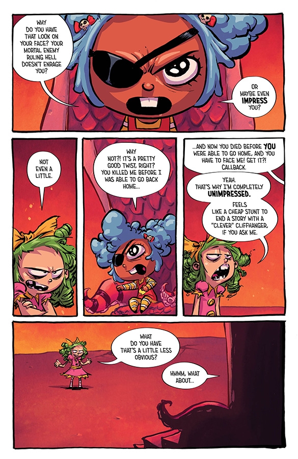 "HELL OF A TRIP" The fourth arc of I HATE FAIRYLAND challenges Gert like never before. Our disaffected heroine finds out her usual bag of tricks may not be enough to deal with what Hell has in store (i.e. eternal damnation, etc...) as her chance of ever making it home creeps closer to zero!