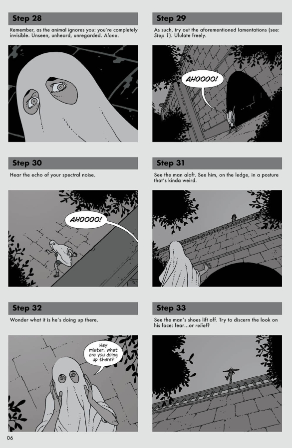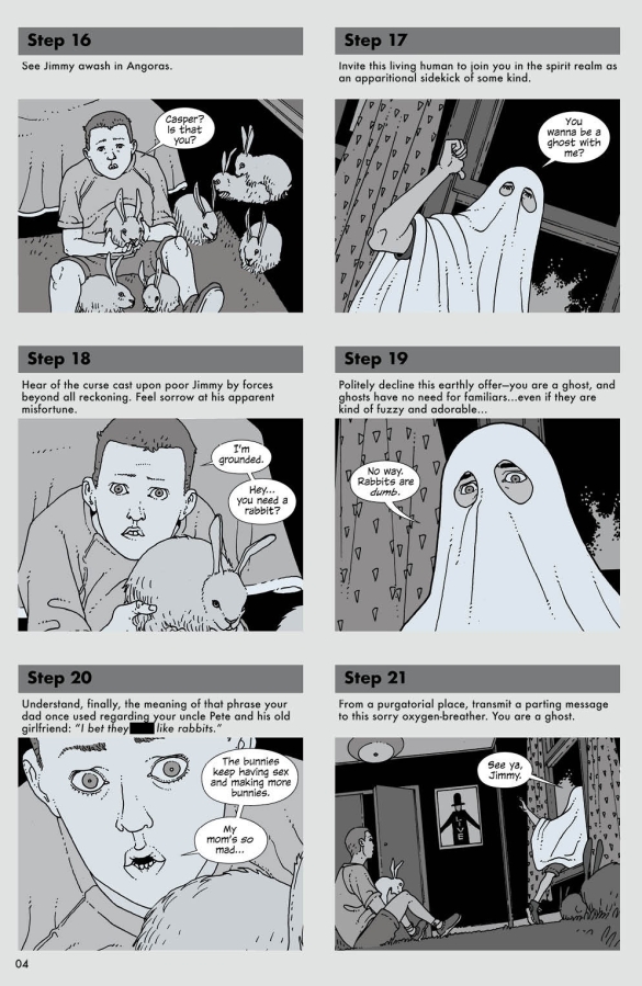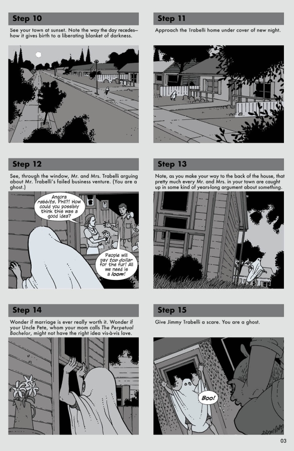 "HAUNTING FOR BEGINNERS"Inside: step-by-step instructions to becoming a better ghost. Includes tips for more efficient apparitioning; how to invisibly observe; methods of spook-improvement.Note: see Section 6 for safety warnings.