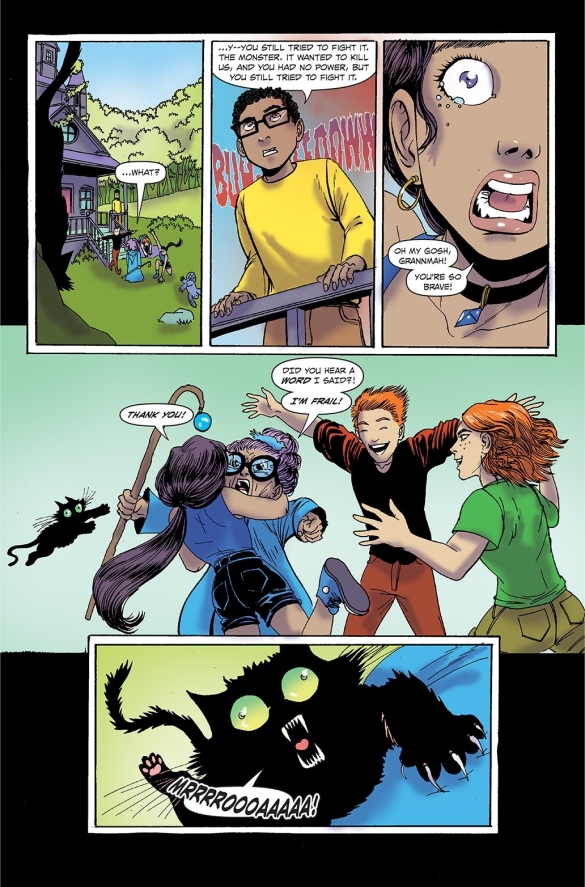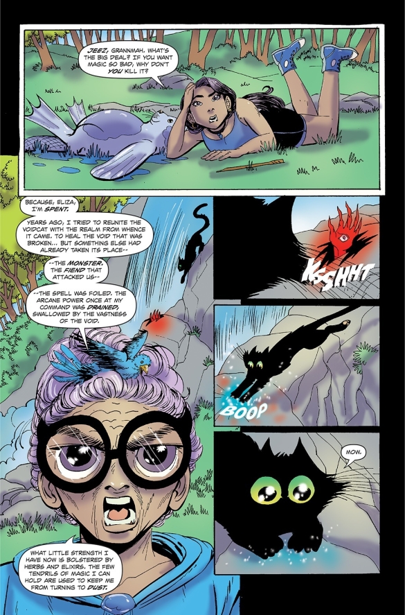 After so much wasted time struggling to contain the cat, the Seeker decides to create a magical bell collar that she can use to track it across the realms. The cat, however, slips away to play with Eliza on Mother Earth.