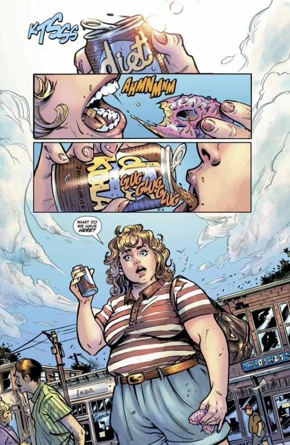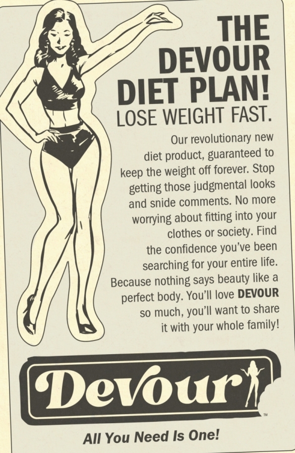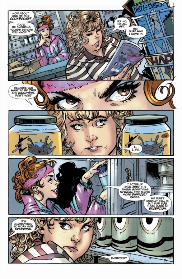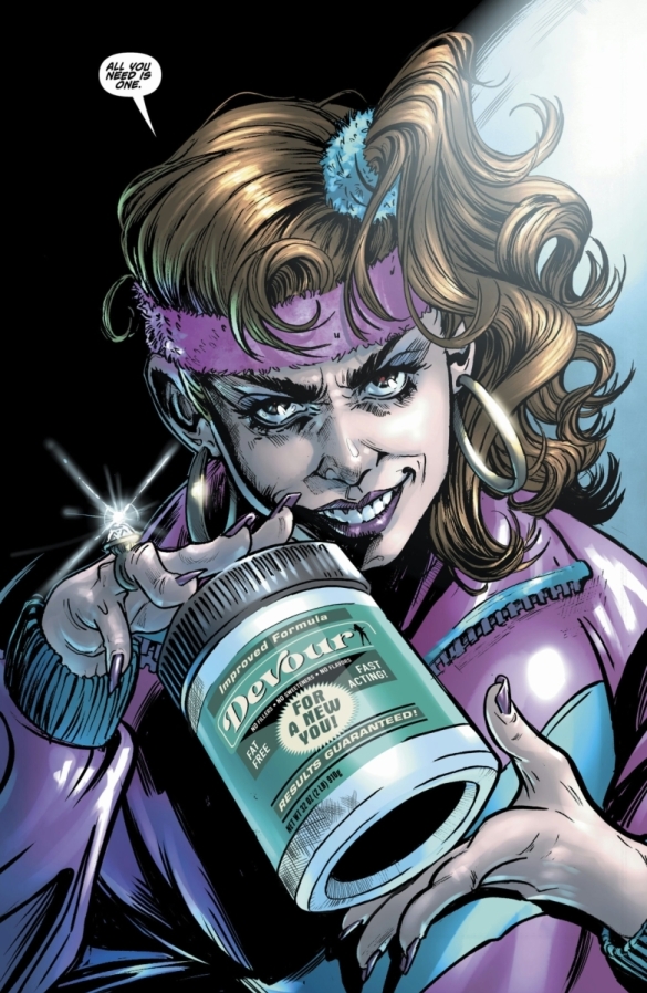 With an impending wedding, Lily needs to lose weight to fit into her wedding dress but struggles to shed some pounds. And what’s worse, her super-thin grandmother relentlessly disparages Lily’s approach, instead lavishing praise upon a quick-fix miracle supplement called DEVOUR, as hawked by the mysterious health guru, MISS GOODBODY. But is taking it worth the cost? In this extra-length one-shot nightmare, when it comes to Devour…all you need is one.