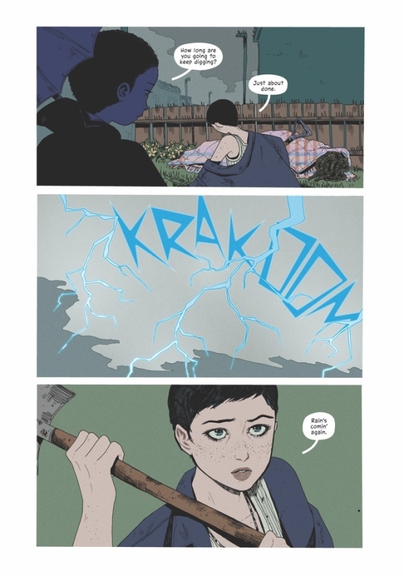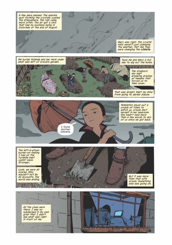 With Templeton and Marc at her side, Honeysuckle says a painful goodbye to Yolanda as they lay her to rest. Jackdaw Street is silent. The crystal rain has spread over the planet. The U.S. has nuked the Eastern European country believed to be the origin of the rain. Waiting for the end of the world, Honeysuckle realizes the source of the rain—and perhaps humanity’s salvation—may be far closer to home…