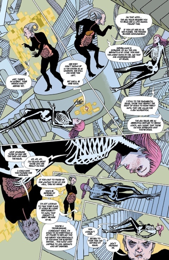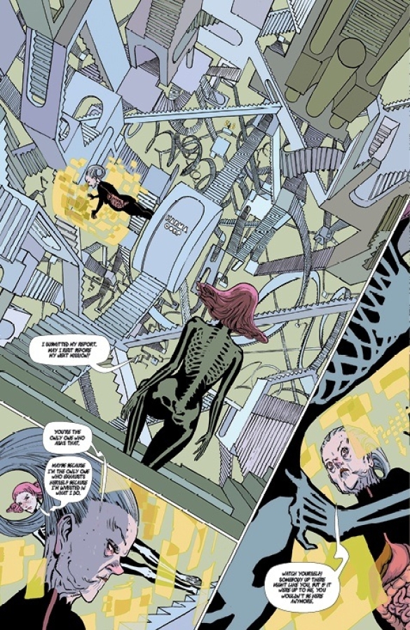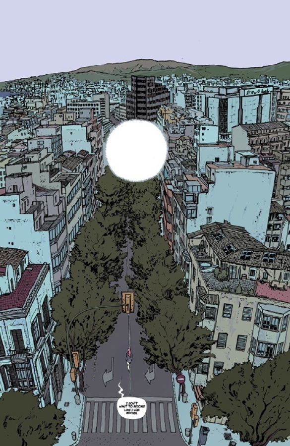 In the fourth issue, we get a glimpse of Karmen’s pitiless working conditions at Karma Corp., where she is seen as a troublemaker. Meanwhile, alone, Cata wanders hostile streets and overhears a conversation that brings a crucial realization about what she truly means to Xisco. Overwhelmed with insights about herself and her past, she races to his flat in the hopes of seeing him. GUILLEM MARCH’s art and deft storytelling reach a gorgeous peak in this second-to-last issue.