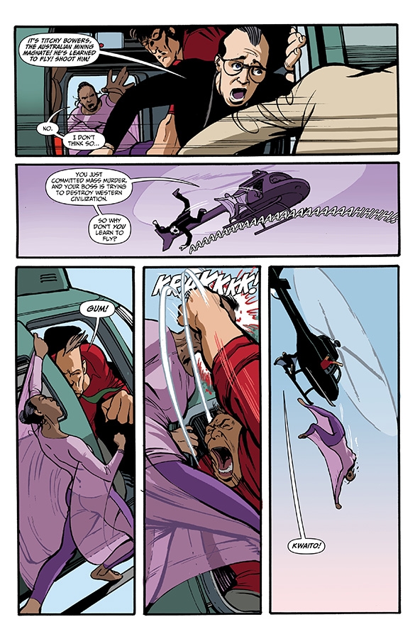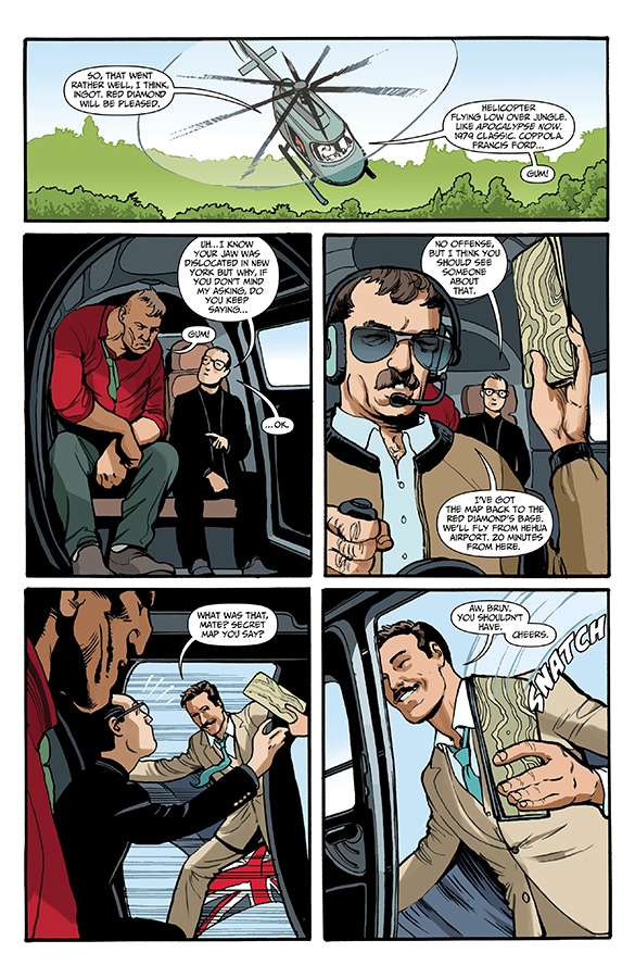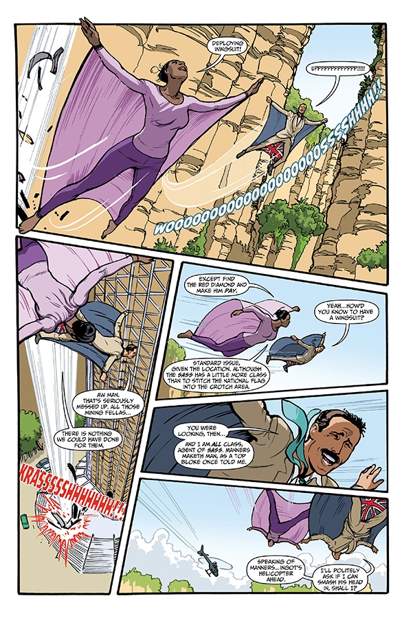 The world's computers have been wiped out. Civilians are rioting in the streets, desperate for food and turning on their neighbors. Meanwhile, somewhere in China, superspy Eggsy's fighting to stop the Red Diamond from crushing the global economy, and he's trying to seduce the beautiful agent Kwaito in the process. His cocky British charm can only get him so far, though, and it doesn't help with his sexual prowess. Issue number four of this action-packed miniseries contains chaos, sex, violence, and crisps.
