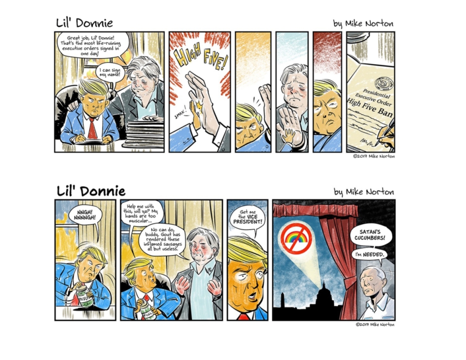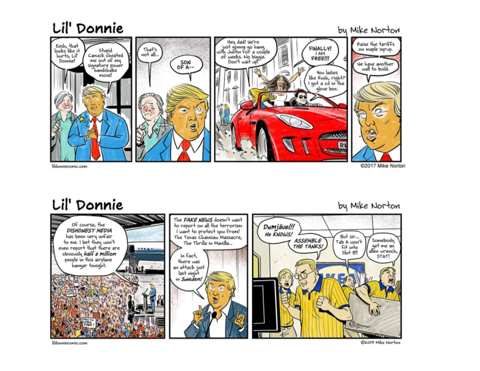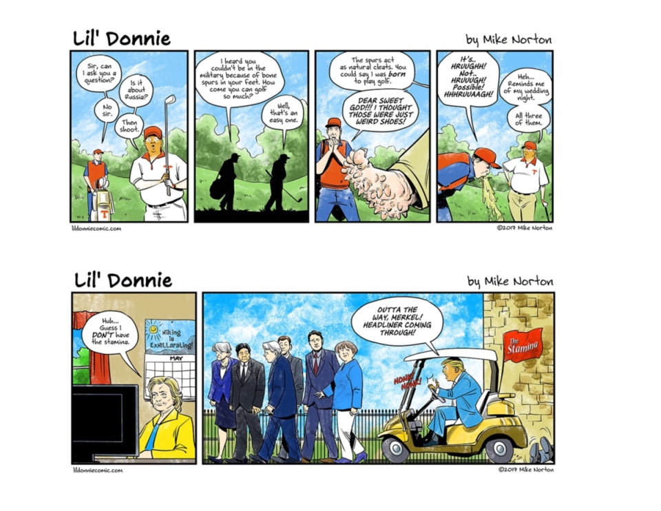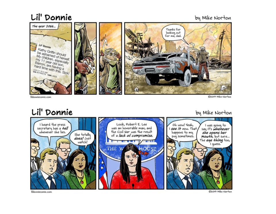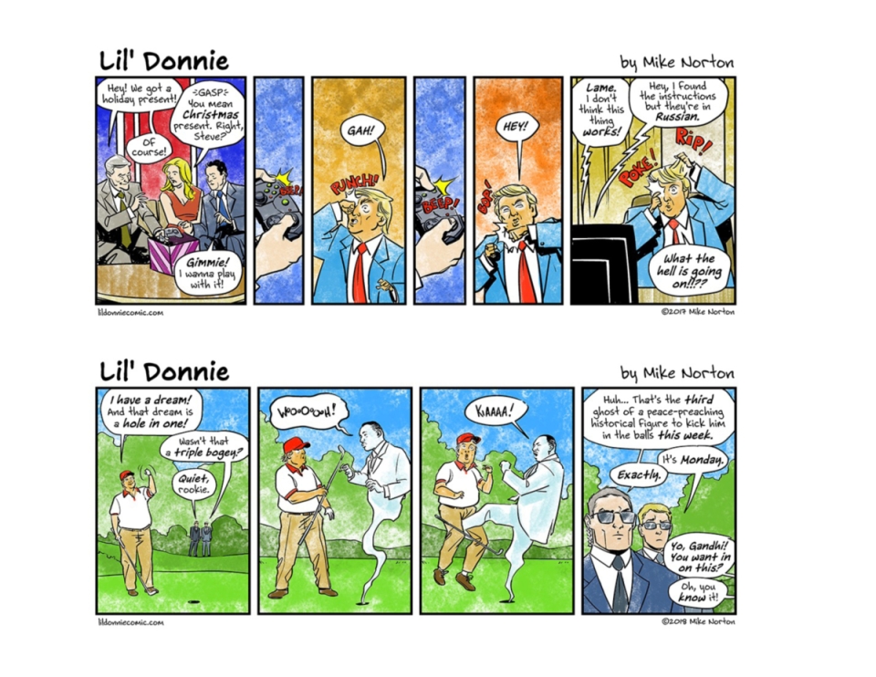9 x 6 landscape format Finally, the acclaimed Rueben Award-nominated webcomic is collected! Follow the timely and terrifying adventures of Lil’ Donnie, the worst president in the history of the United States of America. This collection contains the first year of antics of a truly motley crew of weirdos and degenerates as they work (HA!) to make our world a better place… for them! Get one while we still have a first amendment! Collects the first 125 LIL’ DONNIE comic strips COMPARISON TITLES If Sh*t My President Says—or really any @POTUS tweet nowadays—has you rolling on the floor laughing, then you’ll love LIL’ DONNIE!
