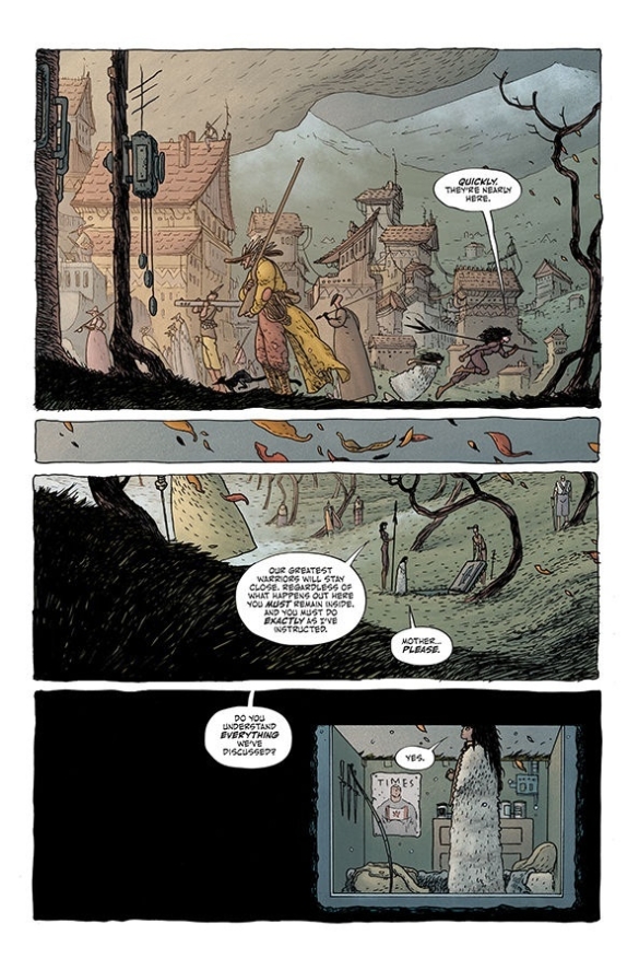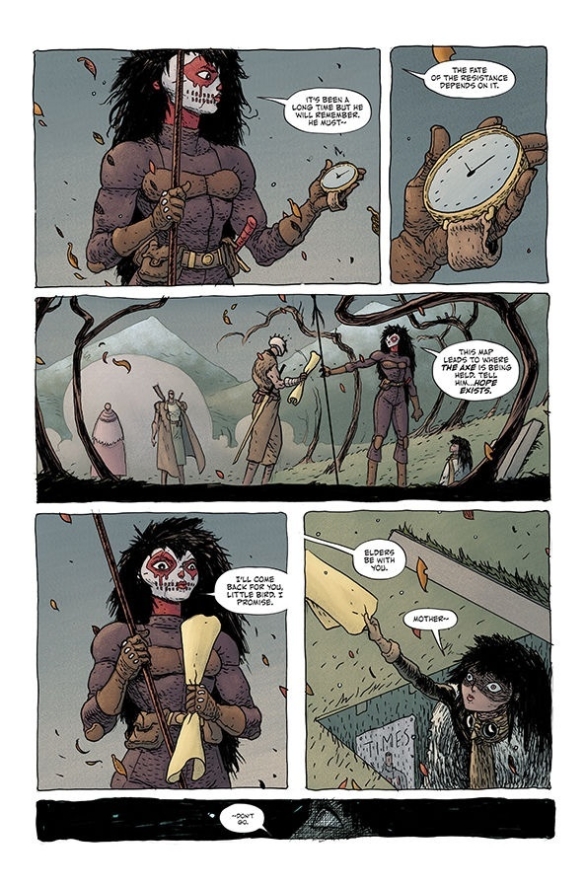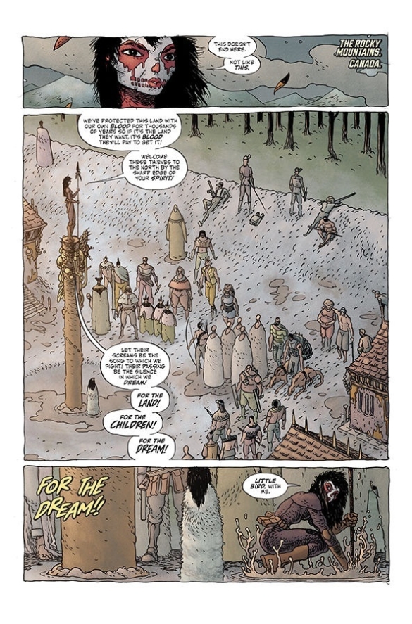 Director/screenwriter DARCY VAN POELGEEST boasts a long list of awards and accolades for his storytelling prowess and brings the same writing finesse to IAN BERTRAM’s breathtakingly detailed artwork in the gorgeous, hyper-detailed miniseries LITTLE BIRD.With the same limitless scope as a new EAST OF WEST or SAGA and the drama and surrealism of Akira, LITTLE BIRD follows a young resistance fighter who battles against an oppressive American Empire and searches for her own identity in a world on fire.