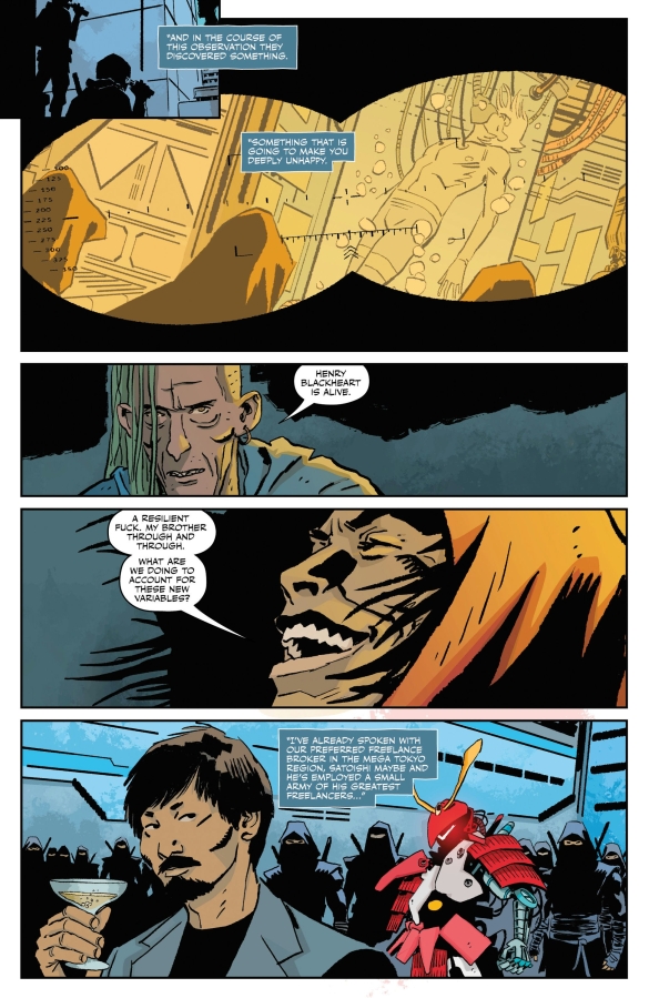 ENTER THE CYBER-RONIN! Still reeling from the climatic events of the last arc and his injuries, Henry is thrust into a new case when a mysterious new adversary begins hunting the great hunters! Plus: FRANKLIN JONAS and CURT PIRES pen another backup that ties directly into FIREBORN! TIMMY HEAGUE (Archie VS Minor Threats) and EAMON WINKLE (GEIGER) bring us the adventures of BOMBSHELL!