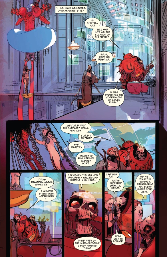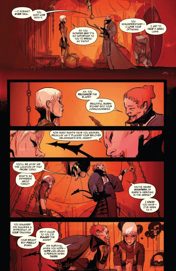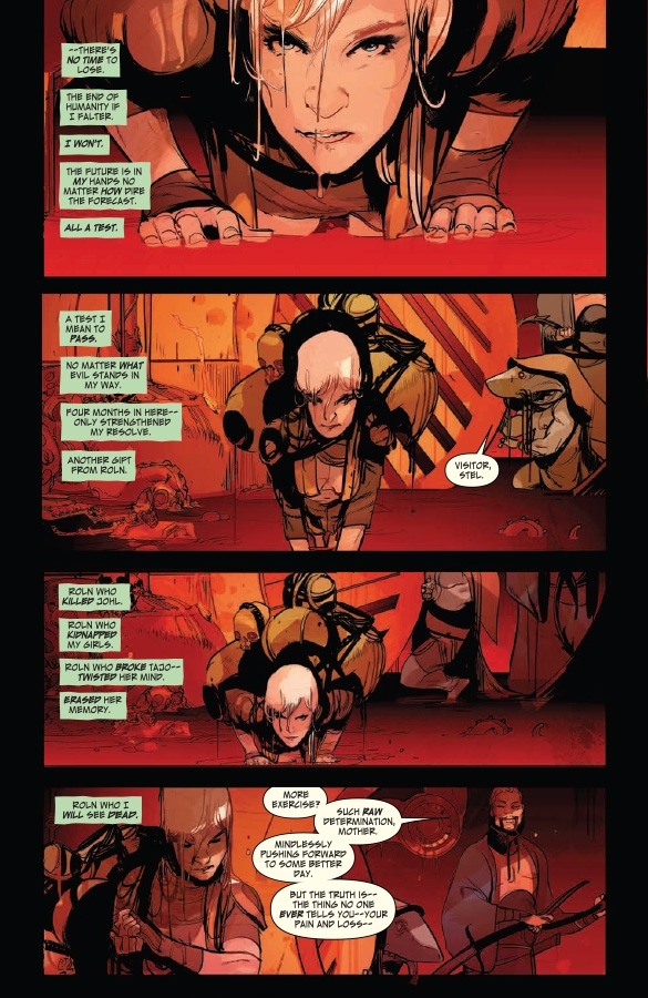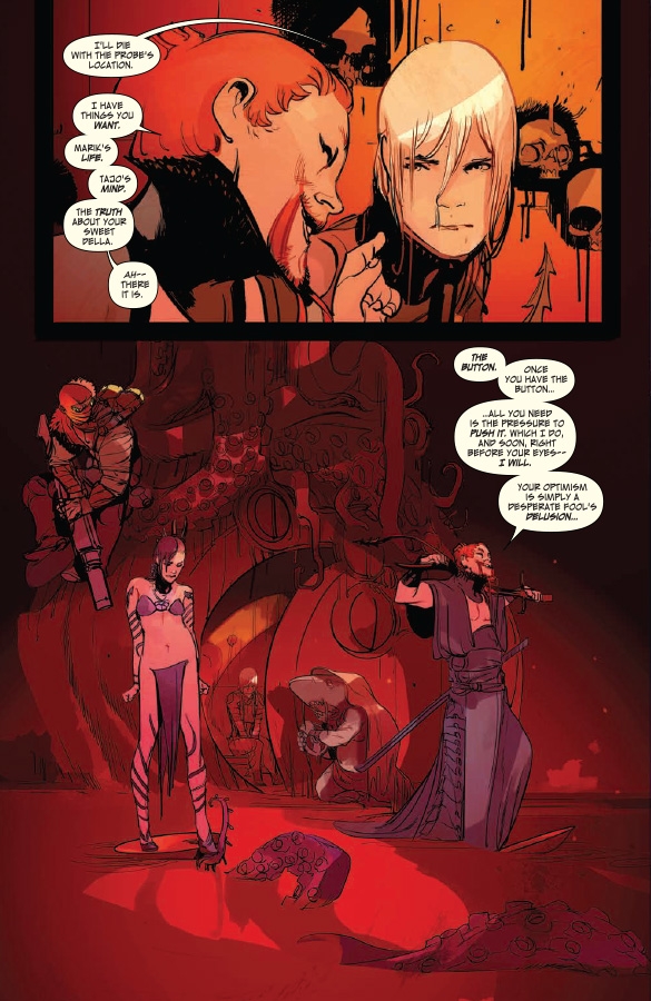 Stel infiltrates the Third City, ruled by the charismatically insane Pirate King Roln, only to find that Roln holds two things very dear to her: her late husband’s Helm suit...as well as the means to pilot it. Don’t miss the chilling conclusion of the first arc of RICK REMENDER & GREG TOCCHINI’s LOW.