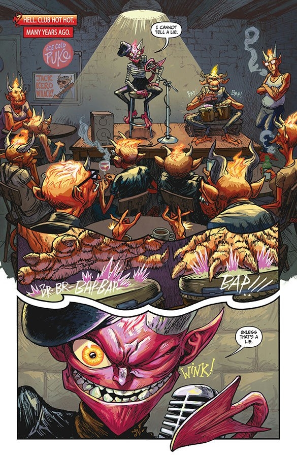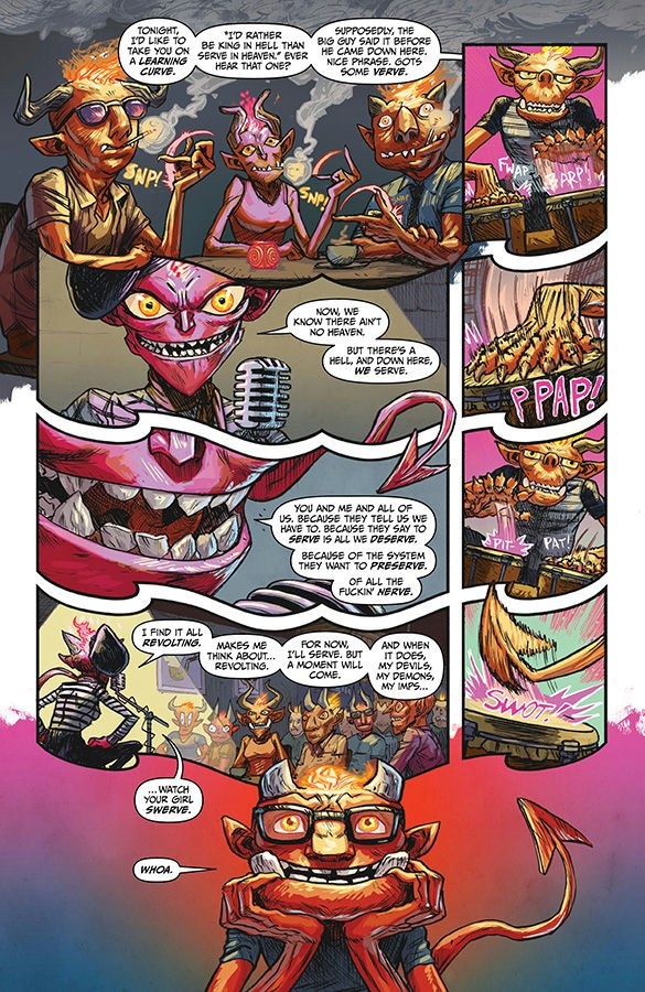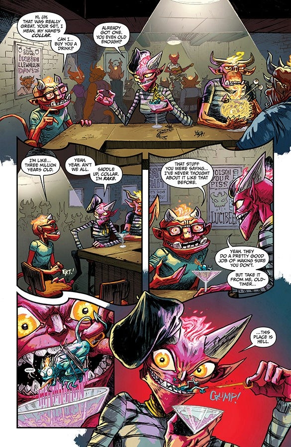 The third circle of Hell is where they stick the gluttons—the folks who just want more! That's how you'll feel when you read the next installment of this infernally delectable title from the creators of EIGHT BILLION GENIES! Cam Stane and Starr Winslow have seen their lives greatly improve since they began working with their shoulder devils, Collar and Rake. But enough is never enough, and the higher they go, the more temptation they face. PLUS: two devils make out at a beatnik bar!