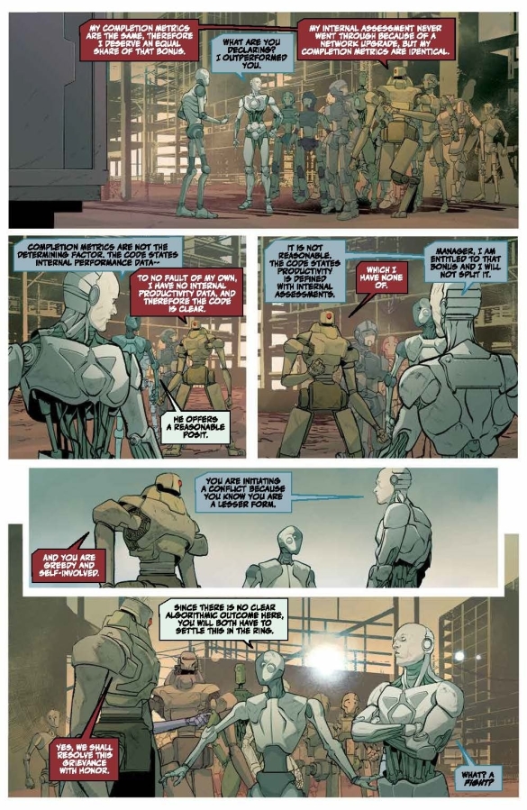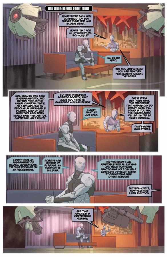 The challenge is made. As our willful heroine Rosa succeeds in securing more human job opportunities, the effort inadvertently displaces construction bot WOL-421313, leading the frustrated, newly unemployed robot to follow a fundamental tenet in robot society and solve his grievance by challenging Rosa to the first ever robot-human fight.