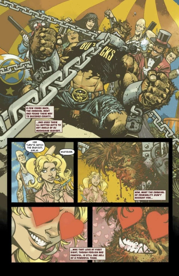 Moonshine Bigfoot has never met a problem he couldn’t handle, but now the sheriff is a killer cyborg and the goons have laser guns that turn people into piles of goo...and Big Level makes their move, too. Not everyone makes it out alive! What we’re saying is this issue goes to eleven, and things will never be the same.