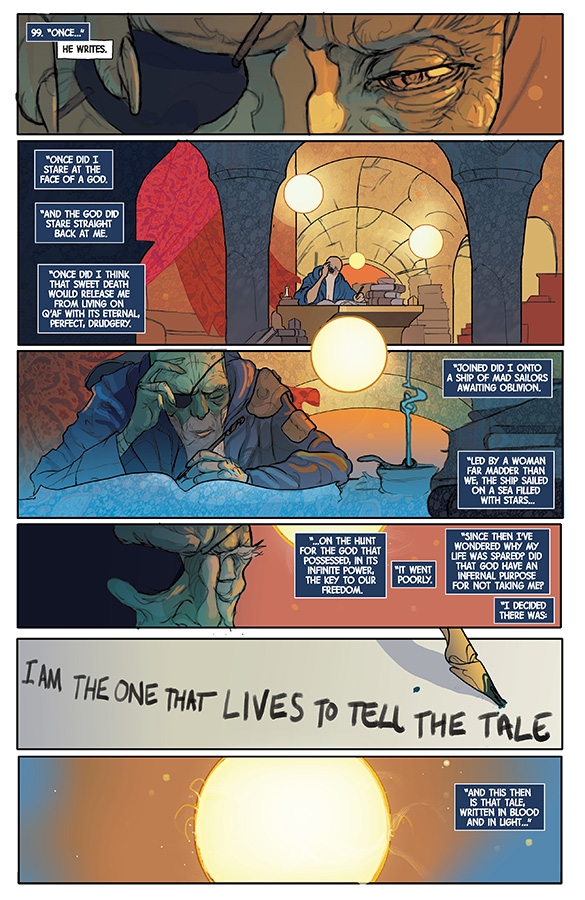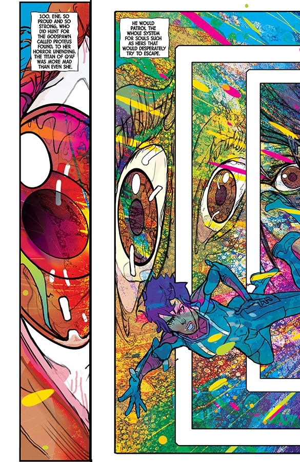 Ene fights a monolithic beast on the outskirts of space and time as He-of-Troiia tells stories in the mad hope to save his life.