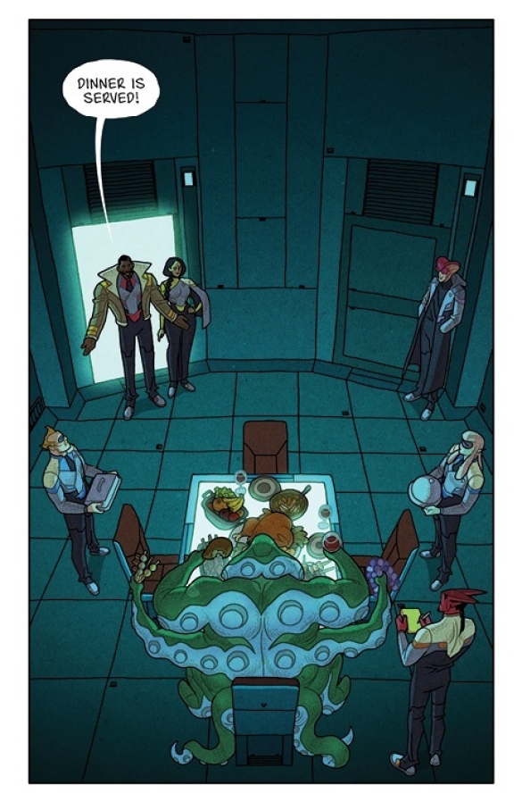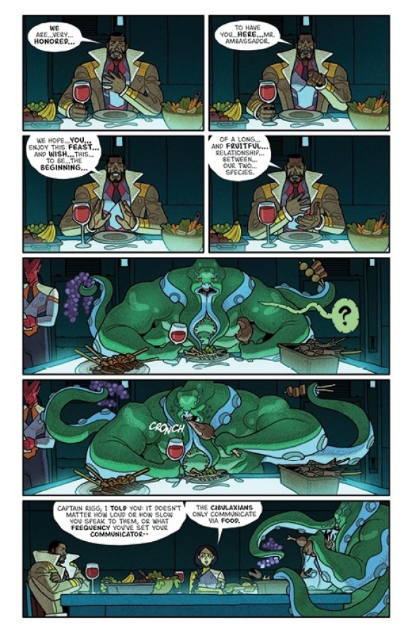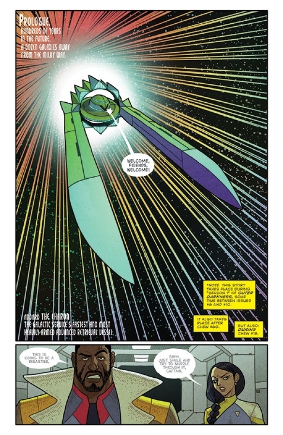 THE GREATEST CROSSOVER EVER!Tony Chu is a modern-day cop who gets psychic impressions from what he eats. Joshua Rigg is a 28th-century starship captain who flies through an outer space filled with demons, monsters, and ghosts. Sounds like a perfect recipe for a comic book crossover, don’t it? Well, be careful what you wish for, because CHEW/OUTER DARKNESS is warping your way, bringing together the reunited multiple Eisner Award-winning CHEW team, writer JOHN LAYMAN and artist ROB GUILLORY, with OUTER DARKNESS’ regular resident artistic genius, AFU CHAN!