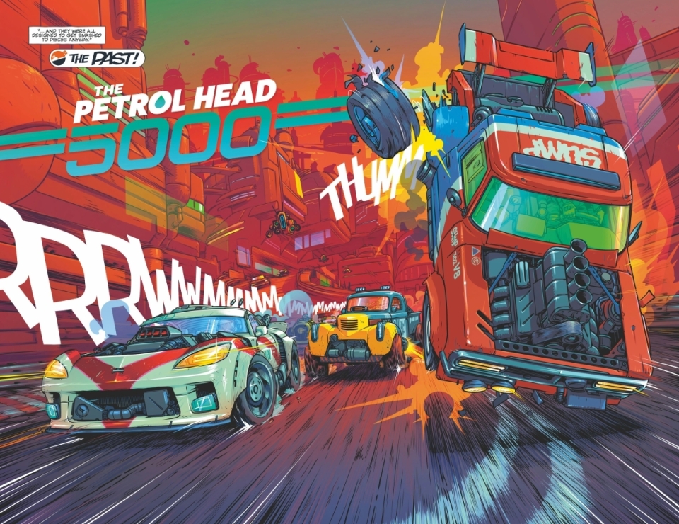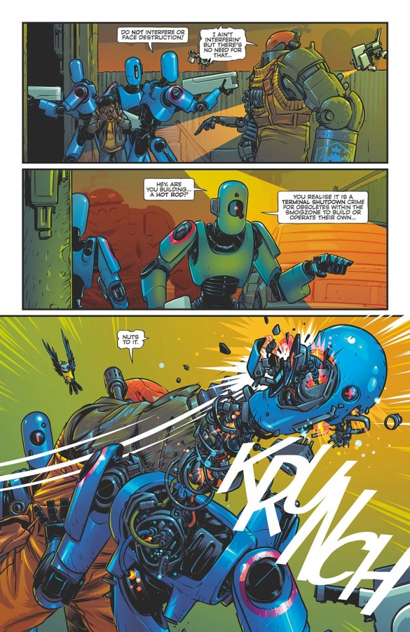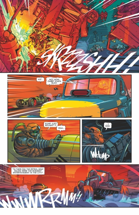 SERIES PREMIEREJUMP STRAIGHT INTO THE NON-HUMAN RACE WITH 42 ROBO-GORGEOUS LAUNCH-ISSUE STORY PAGES! In a climate crisis-ravaged future metropolis, an old, grumpy, obsolete, smoke-belching, cigar-chomping, HOTROD-RACING ROBOT is one 12-year-old girl’s only hope. Together, can they outrace the chasing Robo-Cops with an invention that might just save humanity?
