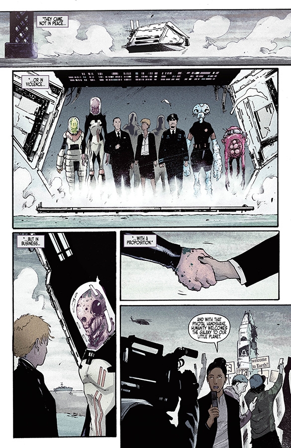 Imagine if aliens came to Earth not in war or peace, but with a business deal: open up a spaceport here on Earth in exchange for advanced technology. But when our alien visitors break Port restrictions and wreak havoc in our cities, it falls to the newly formed Earth Security Agents to hunt down and safely deport the dangerous rogue aliens back to the Port of Earth. A gritty sci-fi action thriller from new comic book writer ZACK KAPLAN (ECLIPSE) and ANDREA MUTTI (Rebels, Star Wars, Batman Eternal, Prometheus).