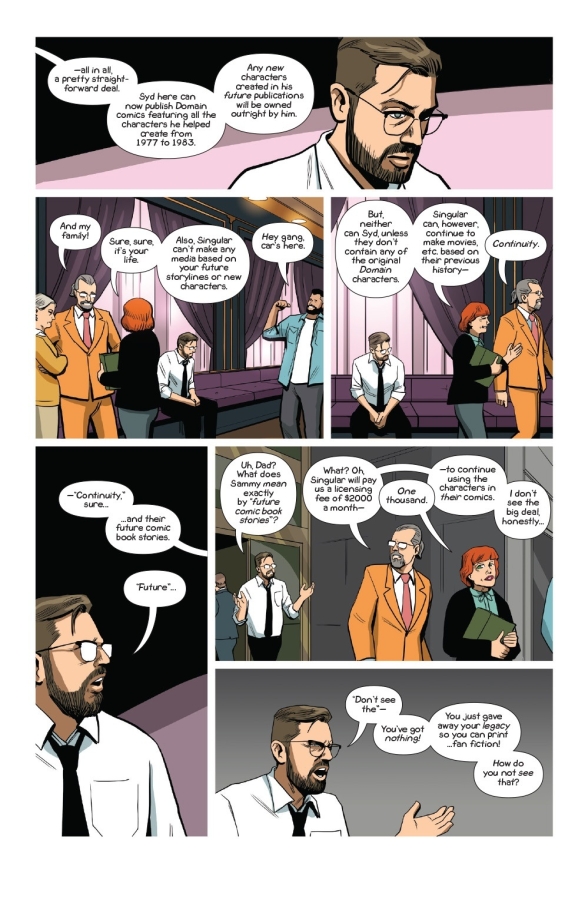 The legal battle is done, but the fighting has just begun! Syd looks to the future as Miles runs from his past! Can he find happiness? Can any of us? Honestly, I’m not sure. I think the most we can ever hope for is to feel content. But what do I know? I’m killing myself writing and drawing comics.