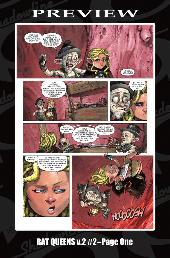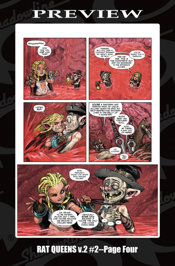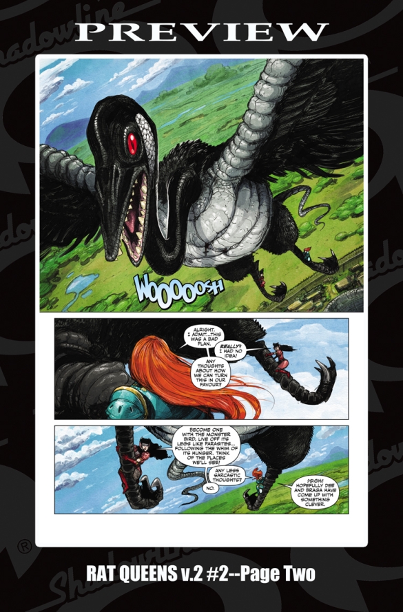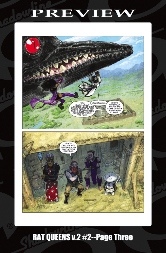 "CAT KINGS AND OTHER GARYS," Part Two Giant goose dragon eat your friend? Best go down in a bloody battle the bards will lament in years to come! The Queens face a terrifying monster while Betty makes a startling discovery about a smidgen gut merchant that threatens her very life! Featuring an original Rat Queens backup comic by acclaimed novelist PAT ROTHFUSS, writer of the internationally best-selling Kingkiller Chronicles!