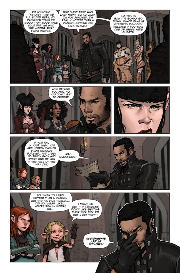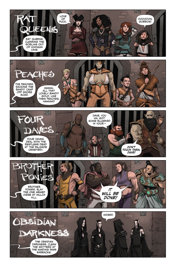 Who are the Rat Queens? A pack of booze-guzzling, death-dealing battle maidens-for-hire, and they’re in the business of killing all god’s creatures for profit. It’s also a darkly comedic sass-and-sorcery series starring Hannah the Rockabilly Elven Mage, Violet the Hipster Dwarven Fighter, Dee the Atheist Human Cleric and Betty the Hippy Smidgen Thief. This modern spin on an old school genre is a violent monster-killing epic that is like Buffy meets Tank Girl in a Lord of the Rings world on crack!