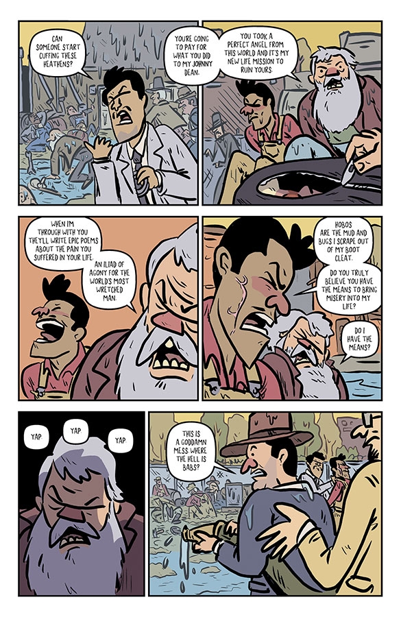 CHAPTER 8: "OH, I’M BOUND TO GO" Your favorite and only Kung-Fu Hobo Epic hits the last stop on its trip, Dear Reader, and we have answers to questions. Will Jackson find redemption via fist-fighting his way into the back door of Heaven and thusly be reunited with his long-lost wife and child? Or will he be stopped in his tracks by the Literal Devil—or worse, Babs Bardoux? Will Pomona ever find happiness? Will Big Sis break something? Will all our hearts be broken? What will happen with the actual trainyard war? Will Hundred Cat do something so gosh darn Hundred Cat you will high five the air? Throw out your legs, friends, and prepare your soul to grab one last blind on the final leg to Rock Candy Mountain.