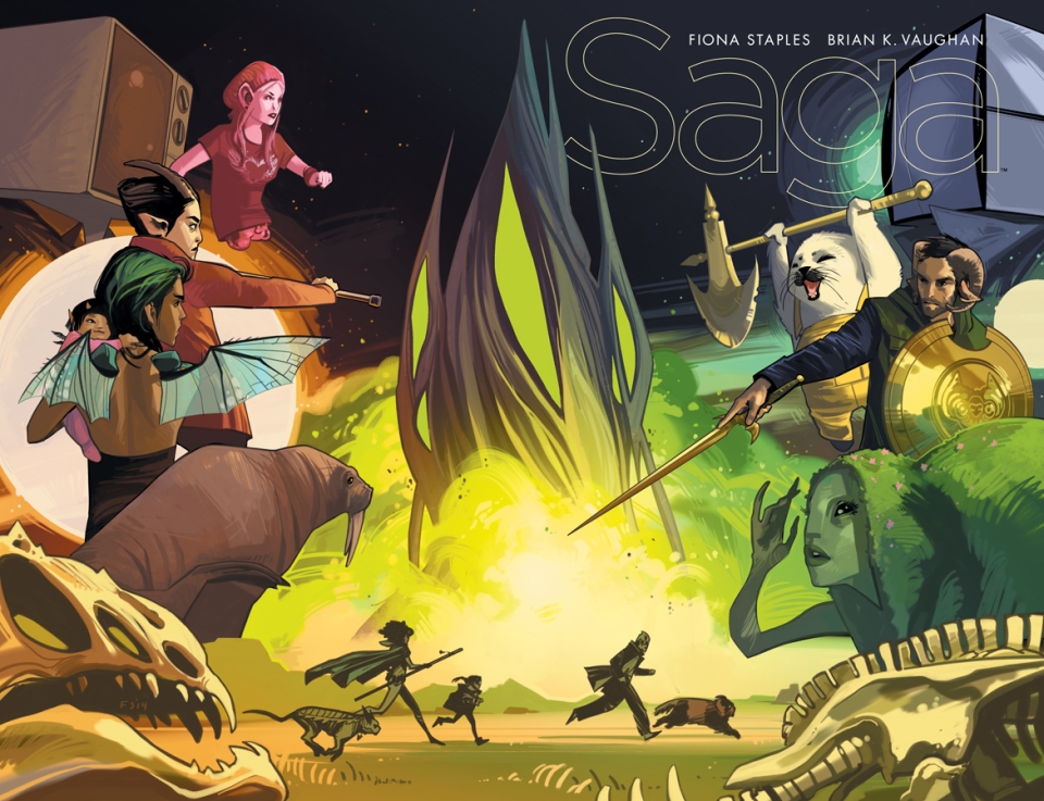 Saga is back, as is almost the entire cast! And as thanks to retailers and readers for helping our audience continue to grow every new arc, Fiona Staples created an amazing wraparound cover for this action-packed issue, which is still only $2.99, the best deal in comics!