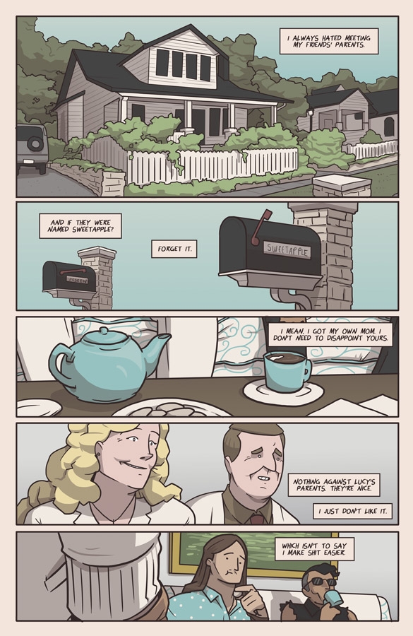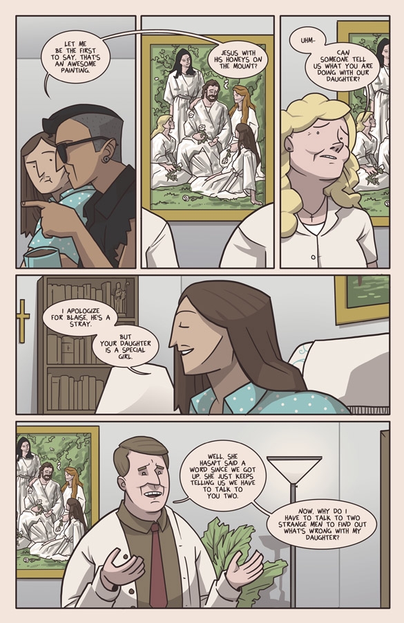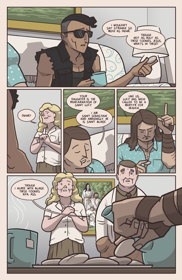 SEAN LEWIS and BENJAMIN MACKEY follow up their audacious debut with a wild issue two. After heading to the suburbs to let Saint Lucy's parents know their daughter will be quitting her job to fight demons full-time, Blaise and the crew drive cross-country to find out the meaning of their shared visions. What they find is a terrified teenage runaway with a dark past and an even darker gift.