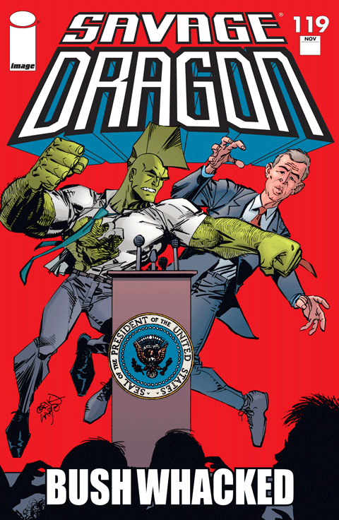 The Running Man, Part One: Bush Whacked CONCEPT: Found naked in a burning field, the amnesiac green-skinned man who would become the Savage Dragon was recruited by the Chicago Police to help them fight their war on crime. Years later, ex-cop Savage Dragon saved the world from a deadly menace from space and a deadlier dictator who had taken control of the Earth itself. Now, married to the woman he loves, he struggles to rebuild this savage planet. THIS ISSUE: "The Running Man," Part One: Bush Whacked-Forces are driving the masses to embrace Savage Dragon as their candidate of choice. Things are not right in Washington as the President of the United States spends the few days leading up to the impending election readying the country for war: a war with the super-powered beings that police the very planet. But things are not always what they seem, and the President is in more danger than he, or anybody else, knows. Plus, an all-new Rock vs. Zeek yarn by Erik Larsen and Frank Fosco.