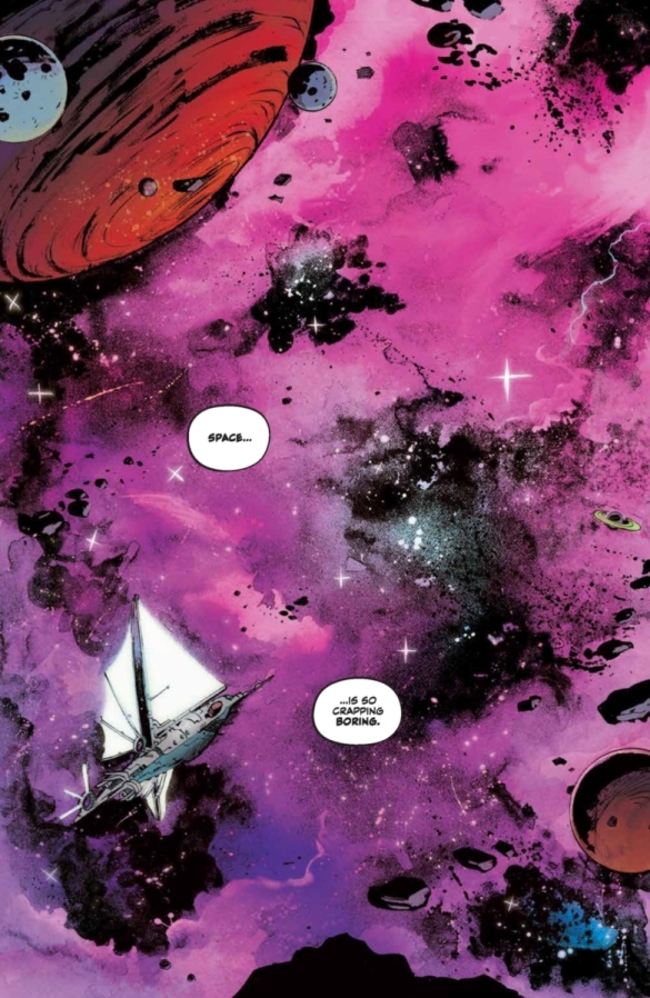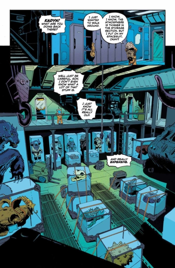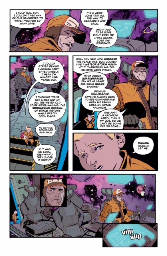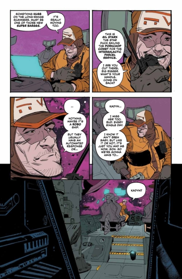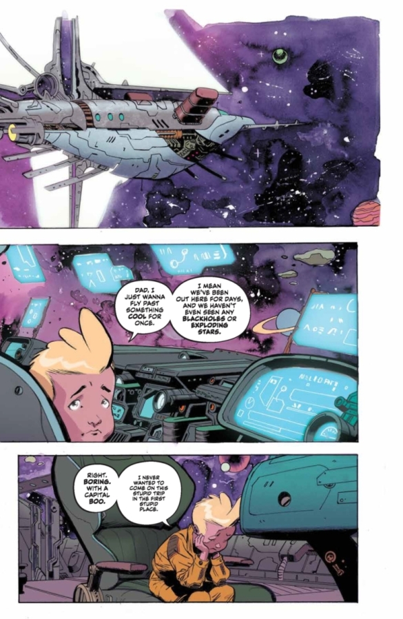 "LOST IN THE WILDS OF HEAVEN," Part OneBeing a space trucker sounds like a cool job, but in reality, it can be boring as hell. So when recently widowed Gil gets a long-haul gig across the universe, he figures it’s safe enough to bring his young son Kadyn along for the ride—that is, until their "big rig" gets bitten in half by a gigantic Space Leviathan! Now separated from his son—with a breached suit that’s venting oxygen at an alarming rate—Gil must defy the odds and stay alive long enough to rescue Kadyn. But meanwhile, Kadyn seems to be getting all the help he needs from a talking Space Monkey riding a Space Dolphin… or maybe it’s the strange powers he’s suddenly manifesting?!From the writing duo of JASON AARON (SOUTHERN BASTARDS, Thor) and DENNIS HALLUM (Cloak & Dagger, Vader: Dark Visions), with dazzling art by STEPHEN GREEN (Hellboy and the B.P.R.D.) and cosmic colors by RICO RENZI (Spider-Gwen), comes a brand-new science fiction series with all the scope and heart of the The Neverending Story crossed with the imaginative weirdness of Miyazaki—an intense, galaxy-spanning adventure that’s suitable for fans of all ages!