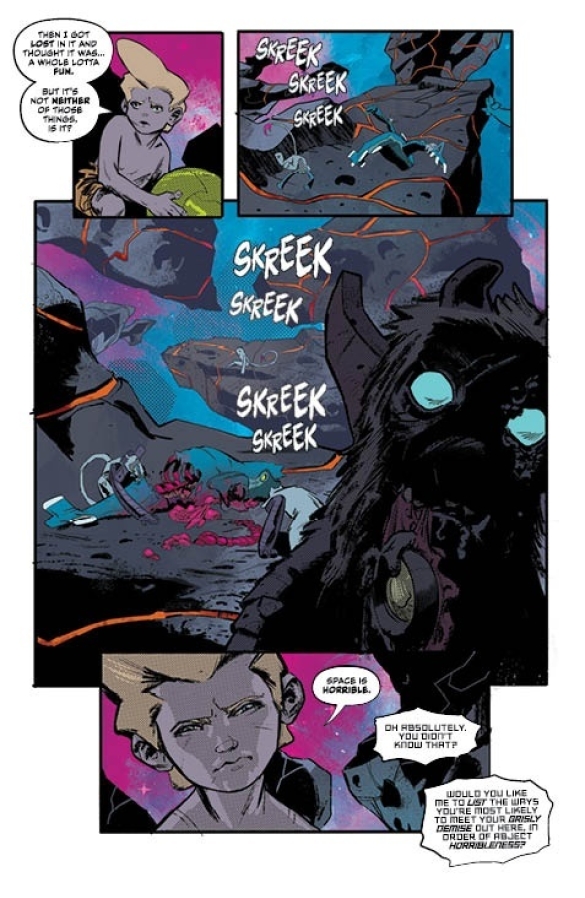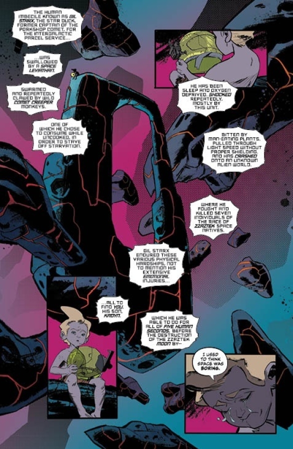 "THE PEOPLE OF THE BROKEN MOON," Part Two Kadyn thought being lost in the wild heavens was the most fun a kid could have. But now he's beginning to see the true face of the deep space danger all around him. Meanwhile his father Gil, who's been fighting every step of the way to find his son, may have finally hit his breaking point...and completely lost his mind.